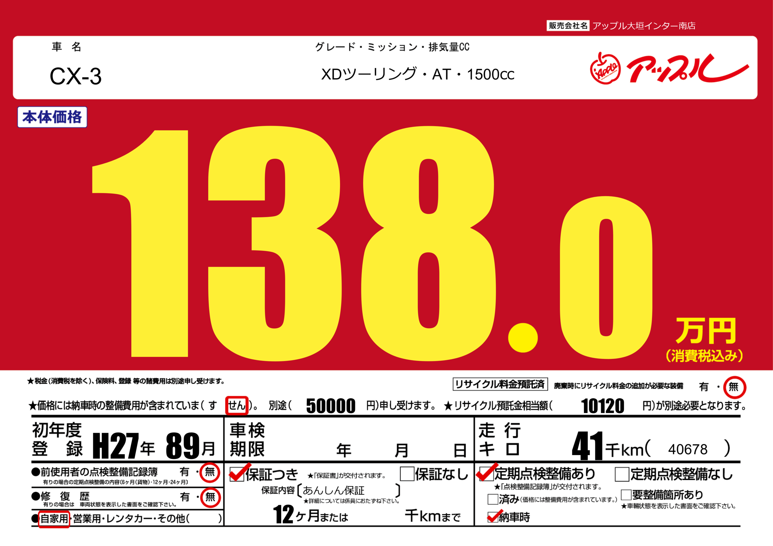 | 車名 | CX-3 | グレード ミッション 排気量 |