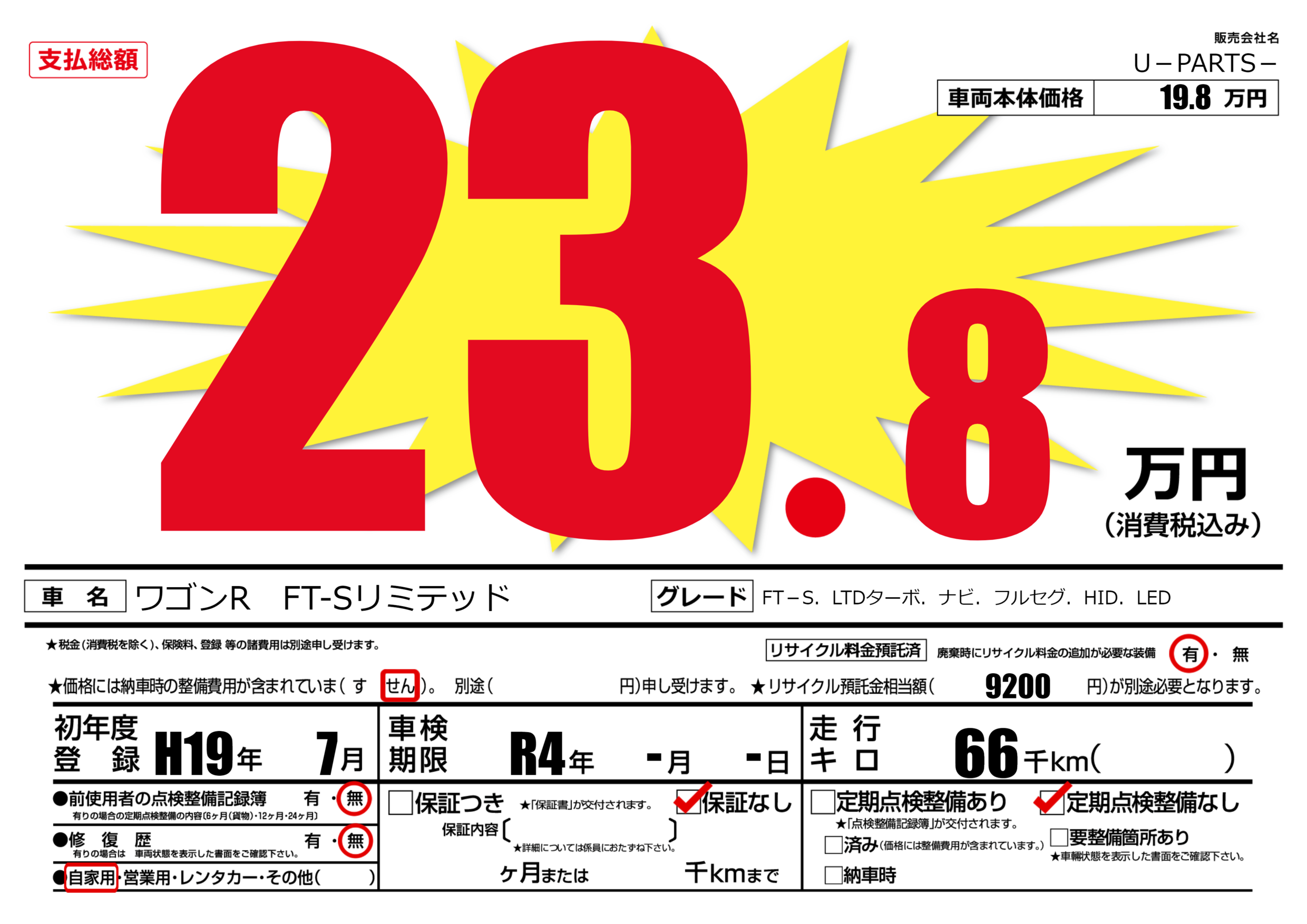 | 車名 | ワゴンR FT-Sリミテッド | グレード ミッション 排気量 |