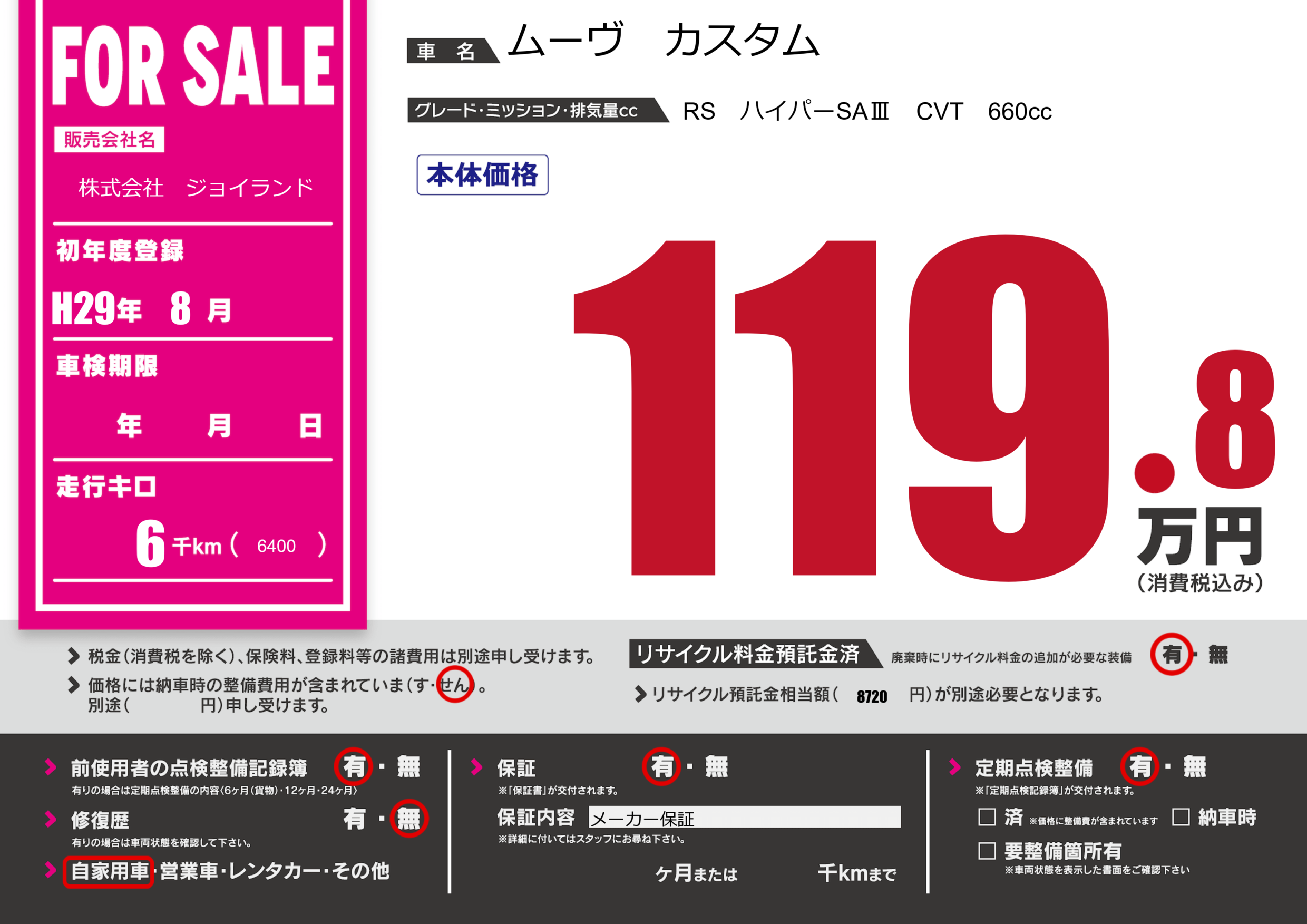 | 走行キロ | 0.6万km | 初年度登録 | H29年8月 |