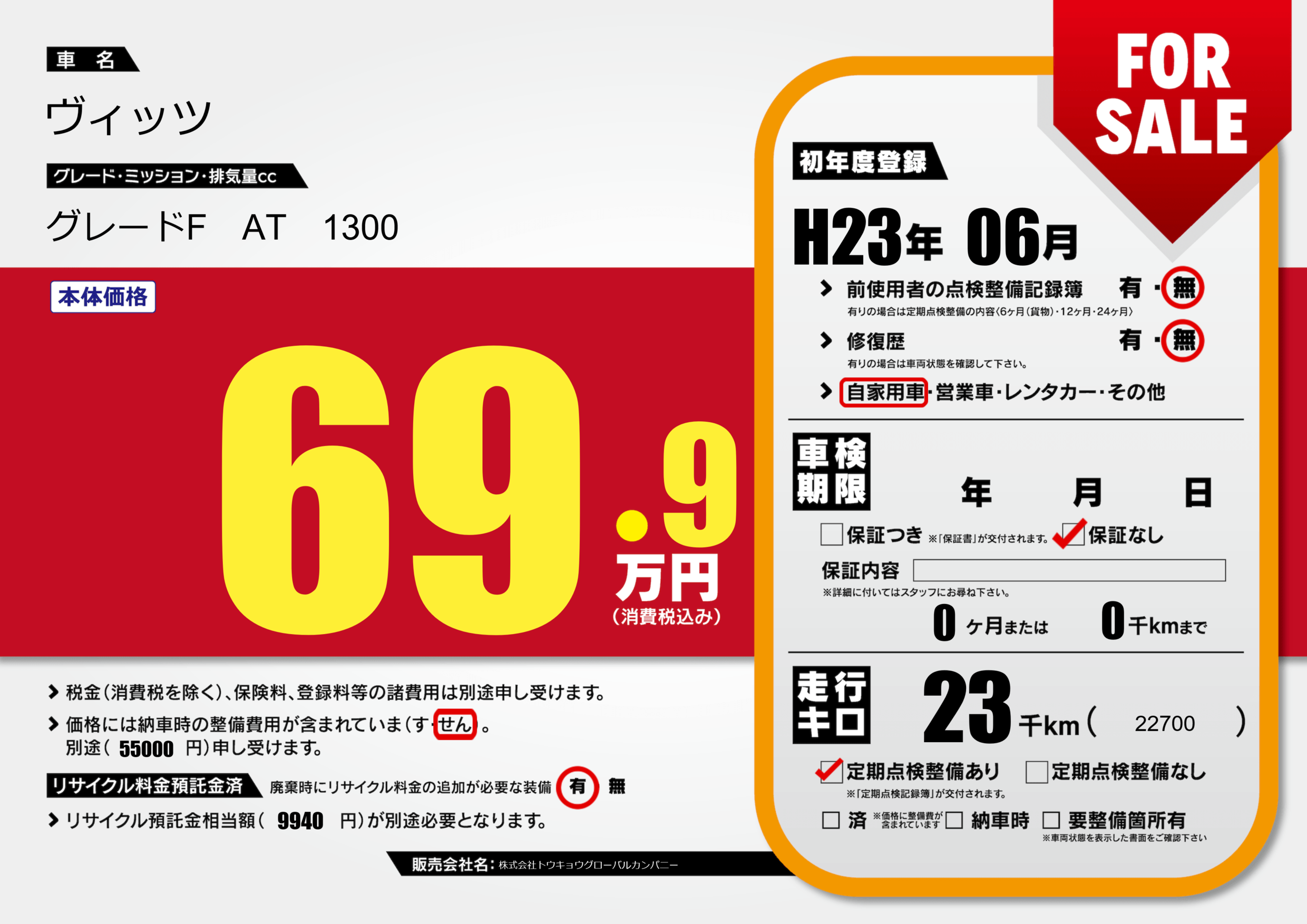 | 車名 | ヴィッツ | グレード ミッション 排気量 |