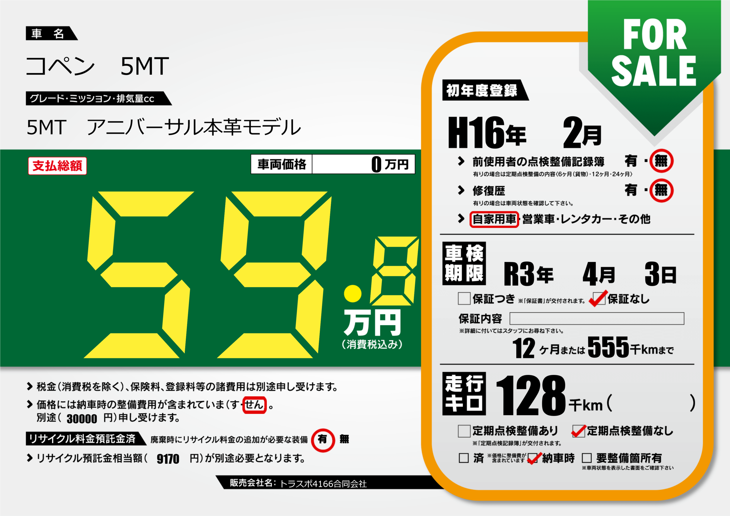| 車名 | コペン 5MT | グレード ミッション 排気量 |