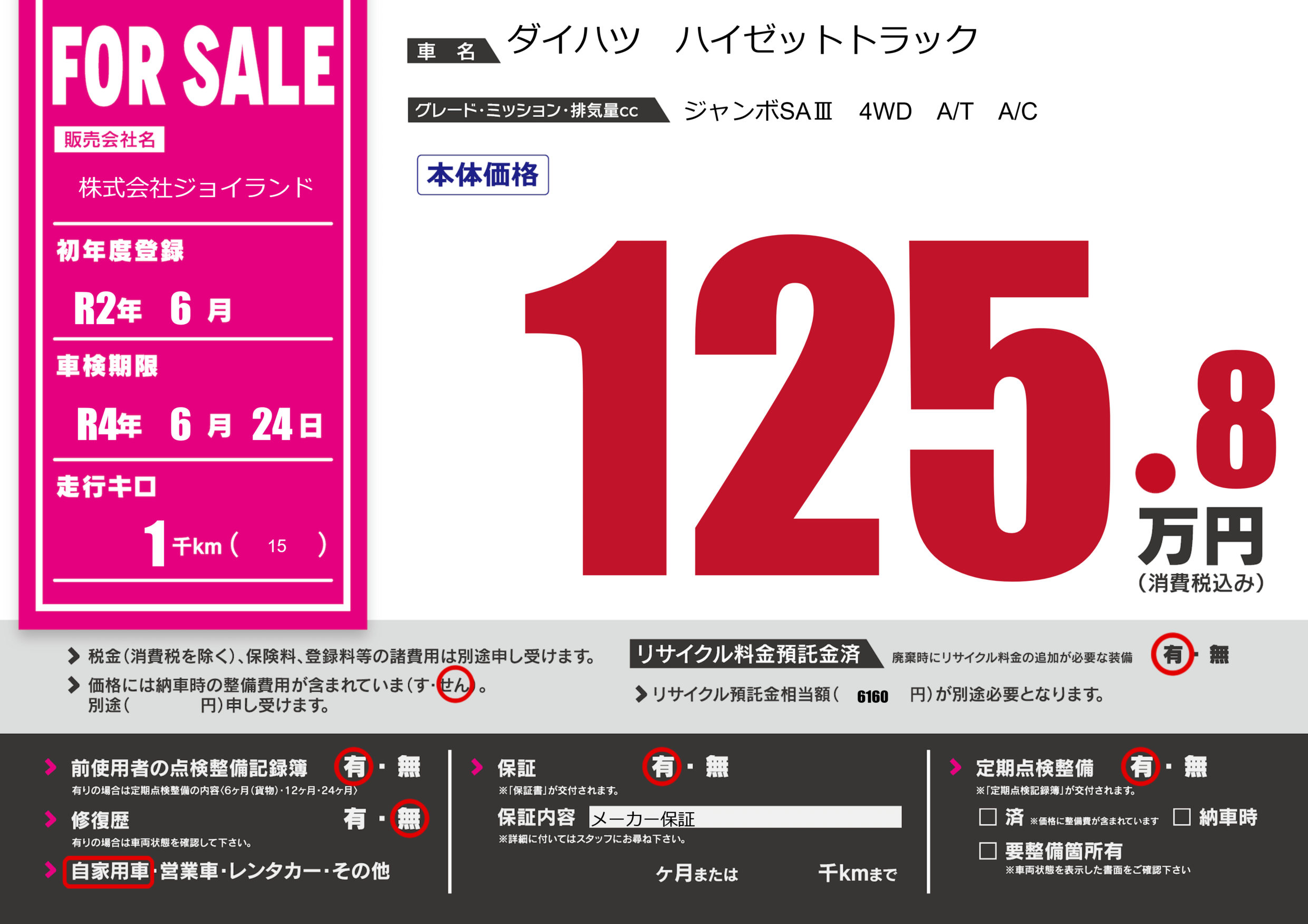 | 車名 | ダイハツ ハイゼットトラック | グレード ミッション 排気量 |