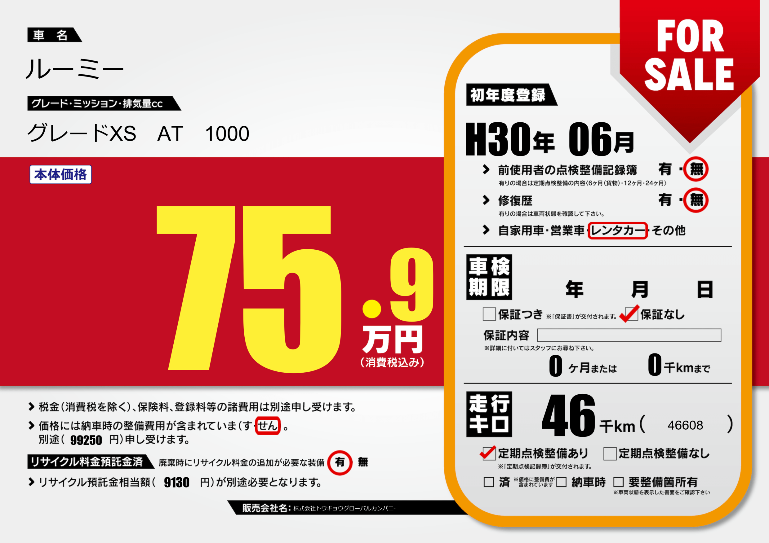 | 車名 | ルーミー | グレード ミッション 排気量 |