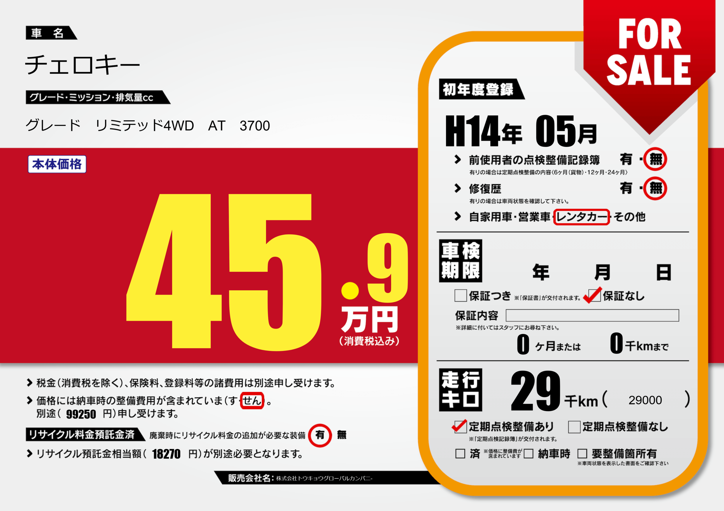 | 車名 | チェロキー | グレード ミッション 排気量 |