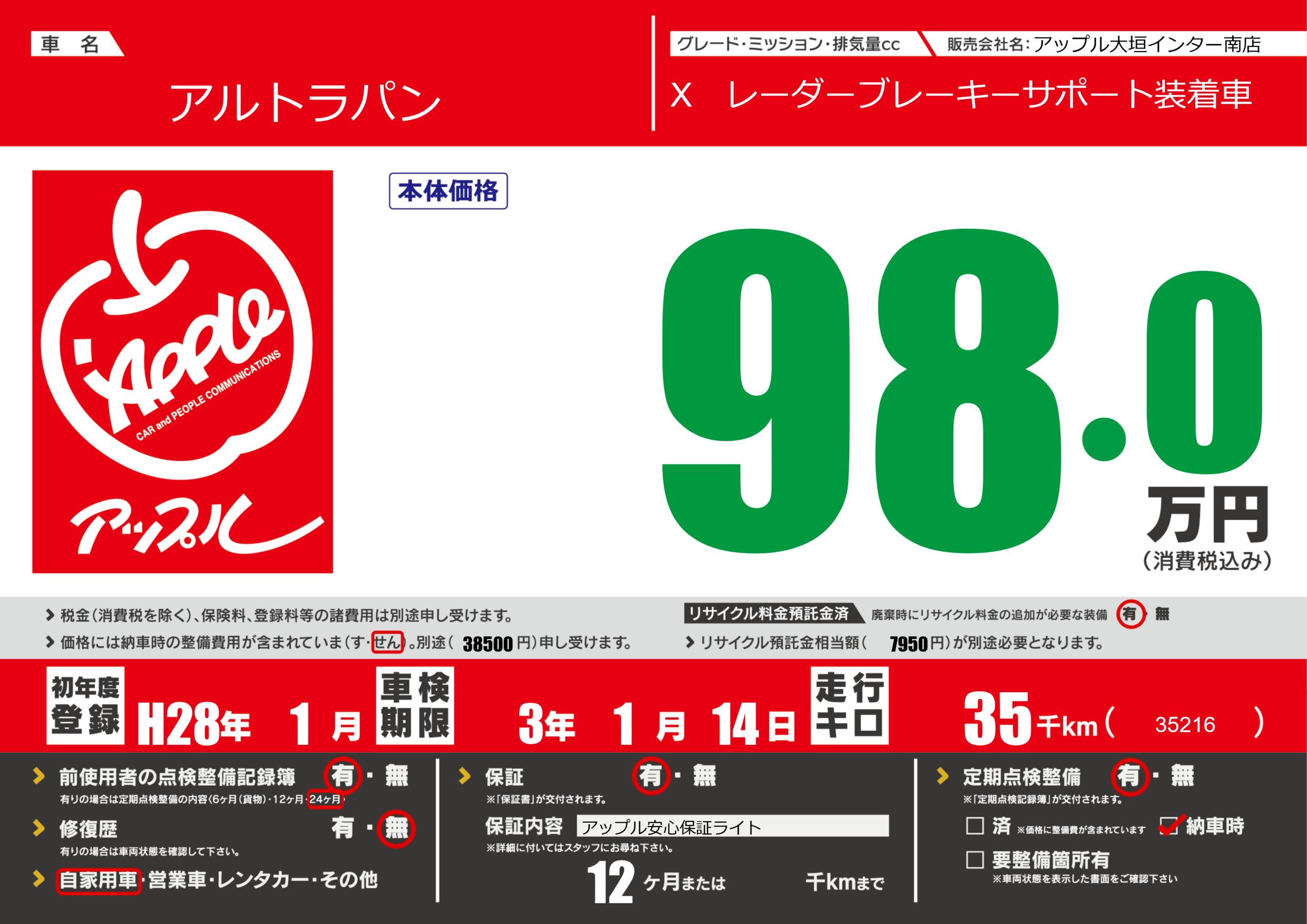 保証付き 保証内容(アップル安心保証ライト) 12ヶ月または()千kmまで |
