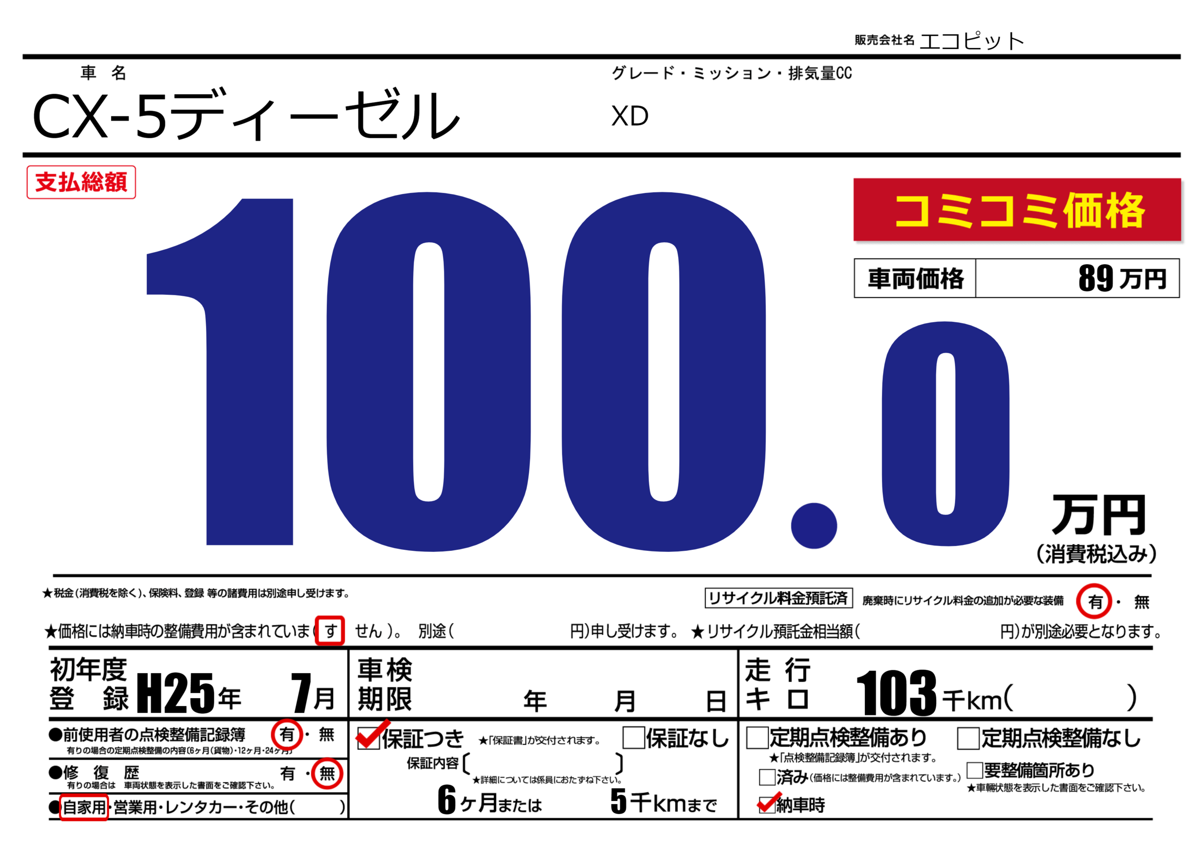| 車名 | CX-5ディーゼル | グレード ミッション 排気量 |