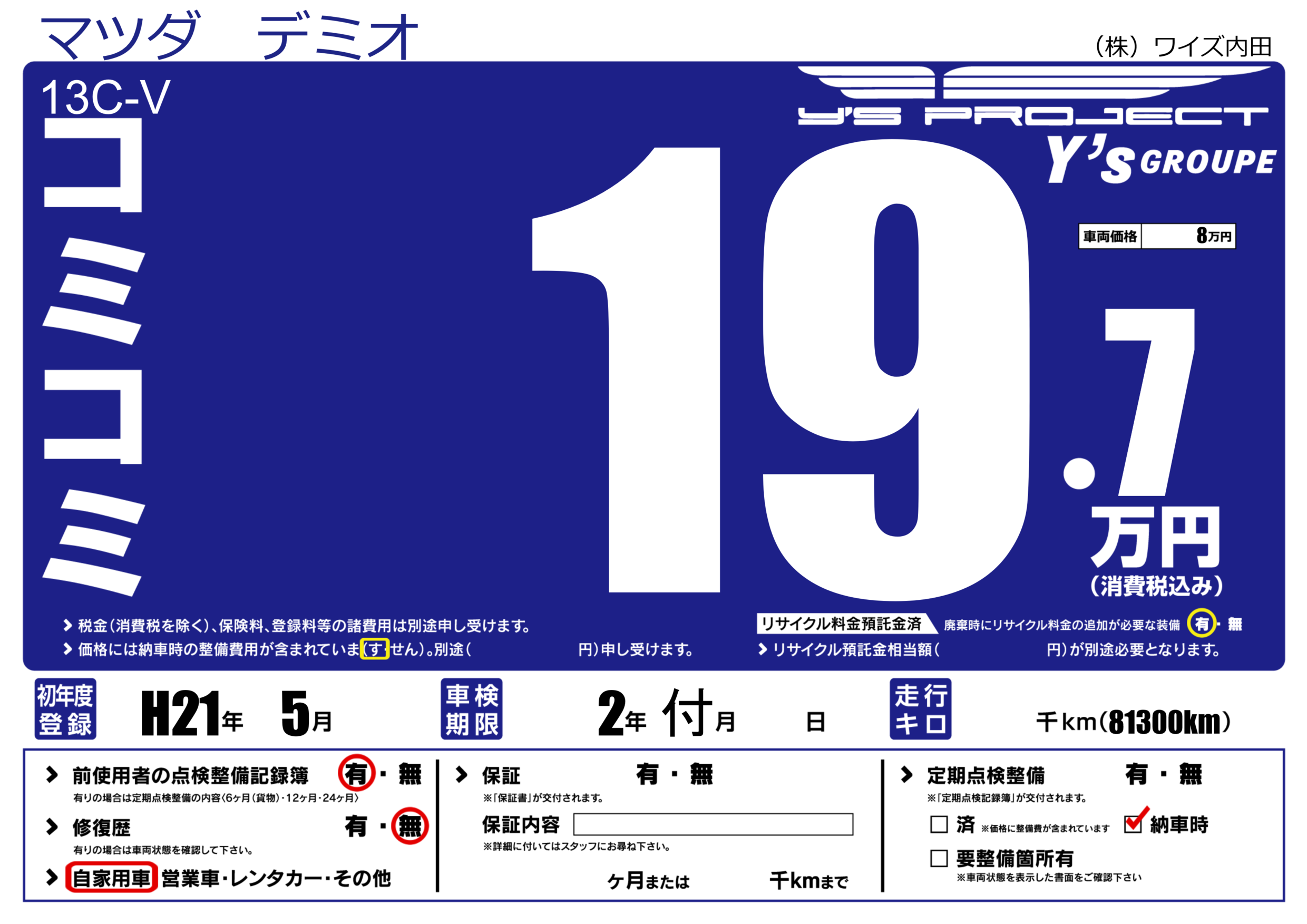 | 車名 | マツダ デミオ | グレード ミッション 排気量 |