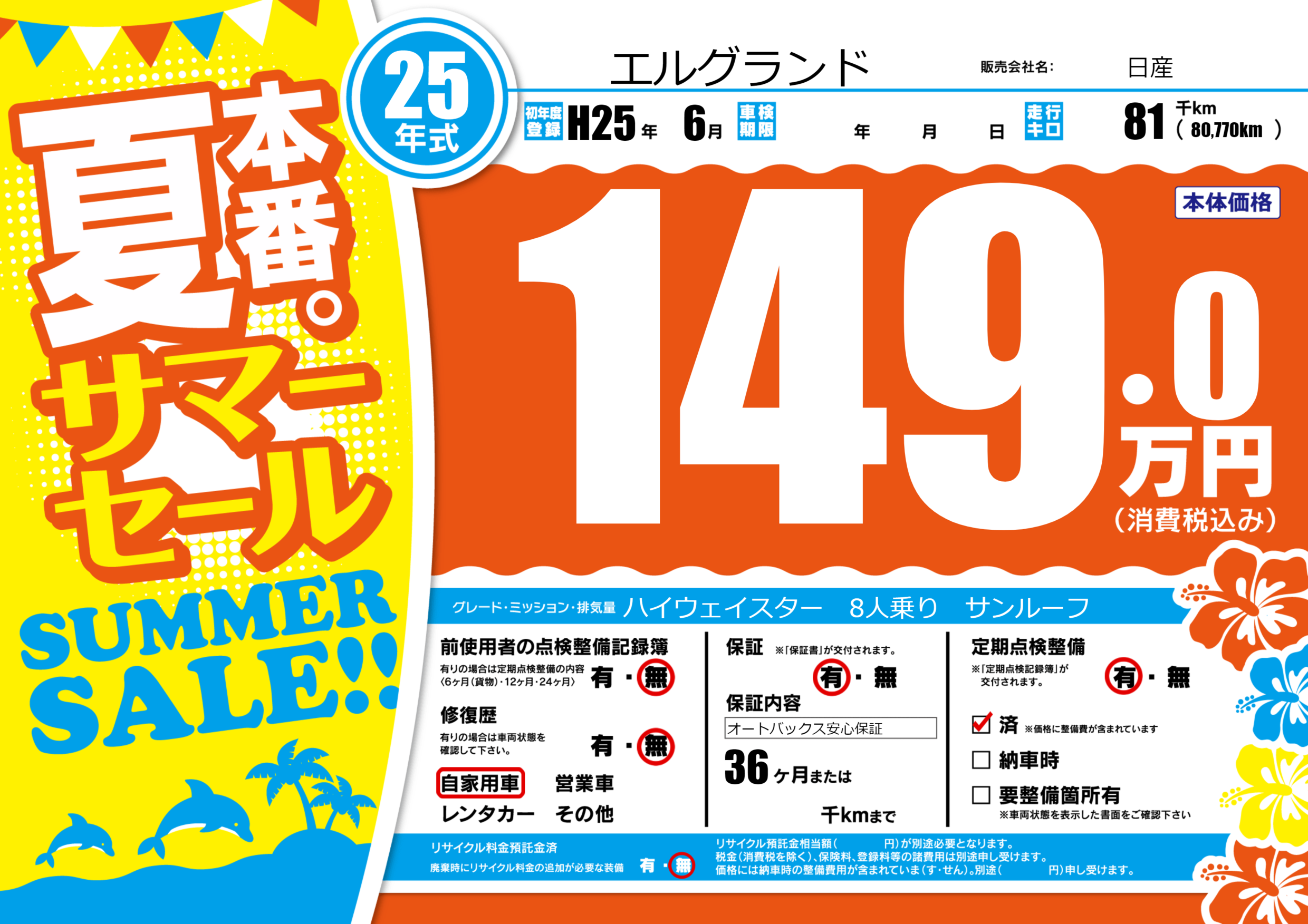 | 走行キロ | 8.1万km | 初年度登録 | H25年6月 |