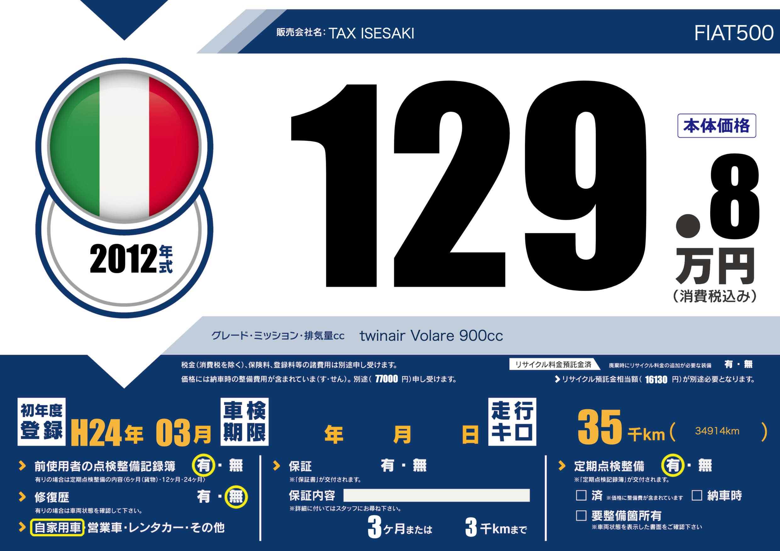 | 車名 | FIAT500 | グレード ミッション 排気量 |