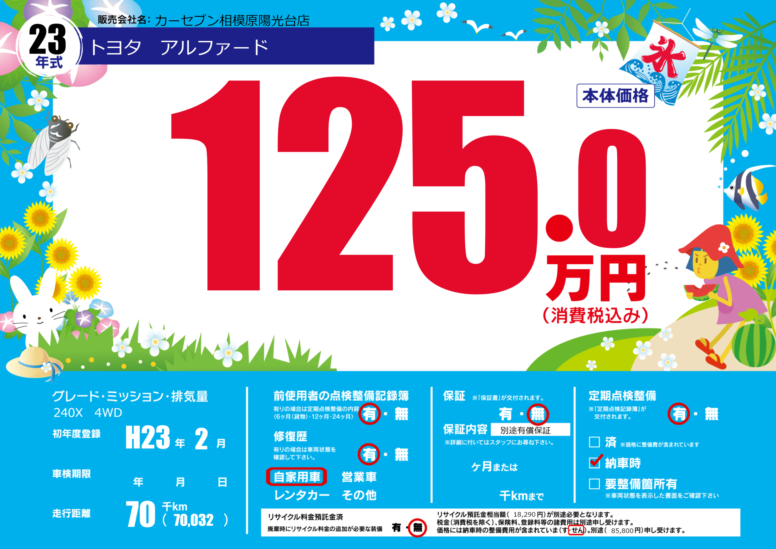 | 走行キロ | 7万km | 初年度登録 | H23年2月 |