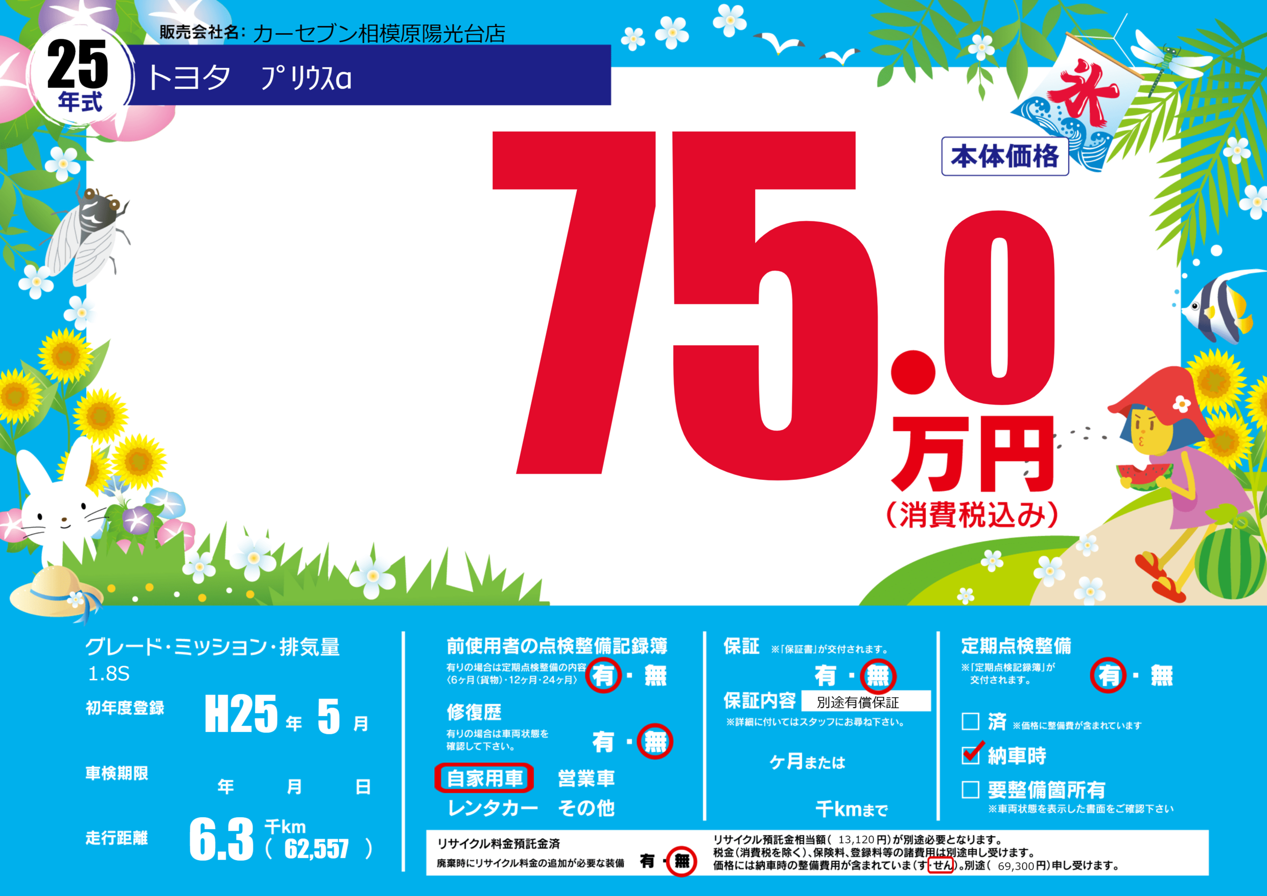 | 車名 | トヨタ プリウスα | グレード ミッション 排気量 |