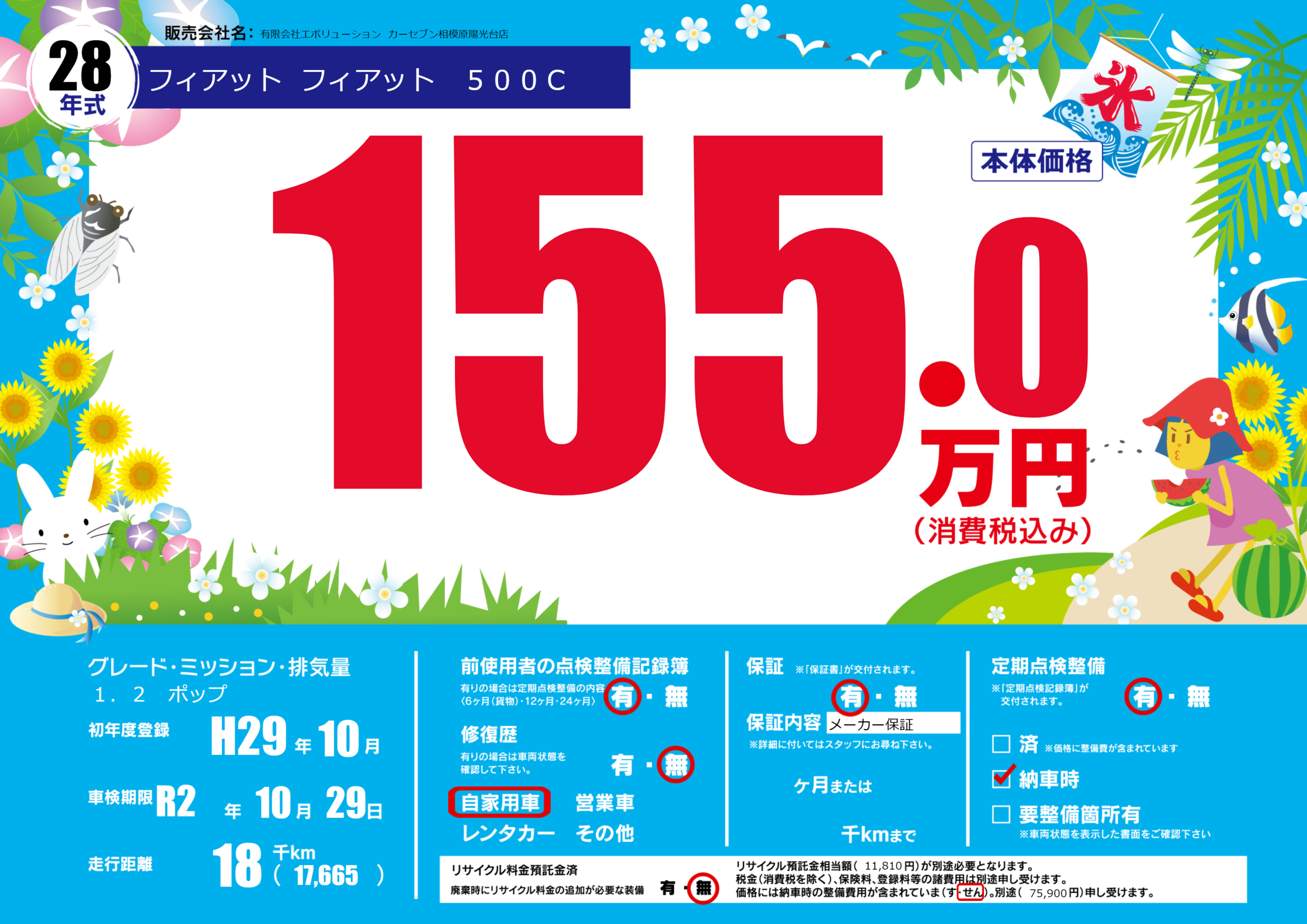 | 車名 | フィアット フィアット 500C | グレード ミッション 排気量 |