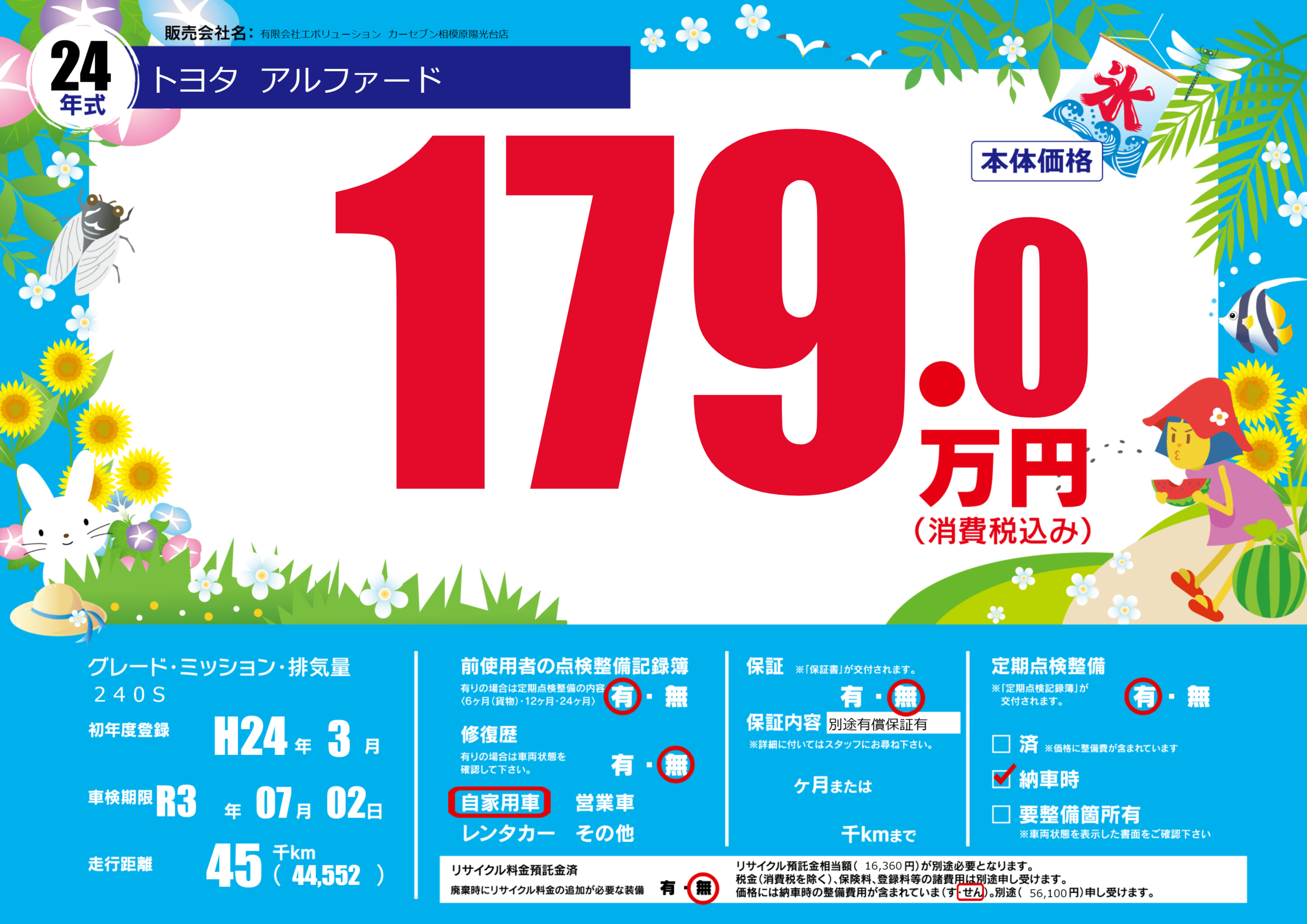 | 車名 | トヨタ アルファード | グレード ミッション 排気量 |