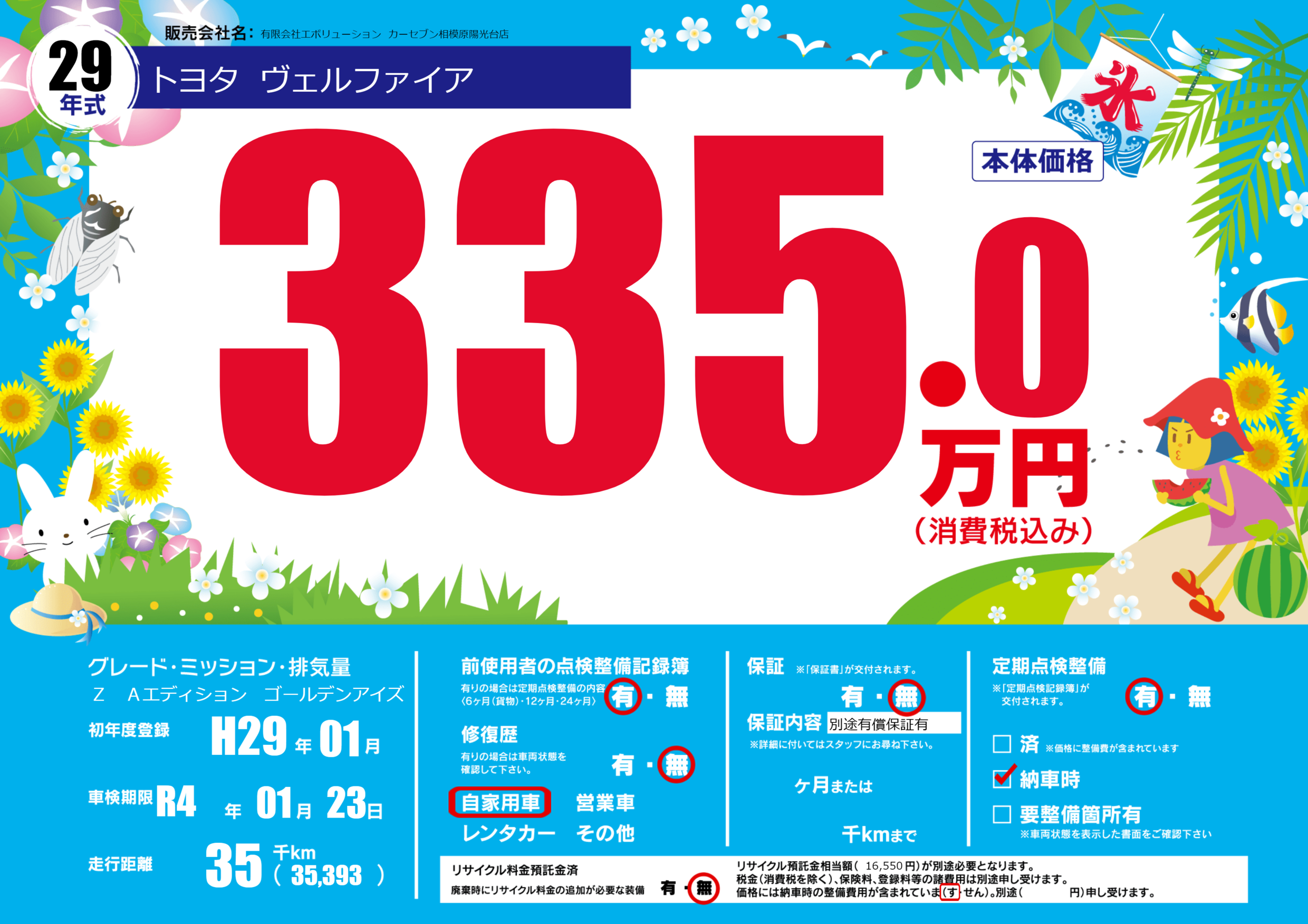 | 車名 | トヨタ ヴェルファイア | グレード ミッション 排気量 |