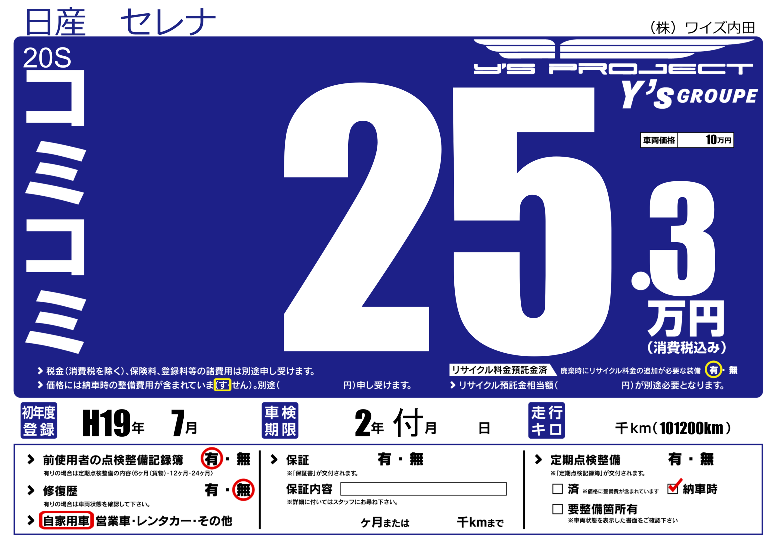 | 車名 | 日産 セレナ | グレード ミッション 排気量 |