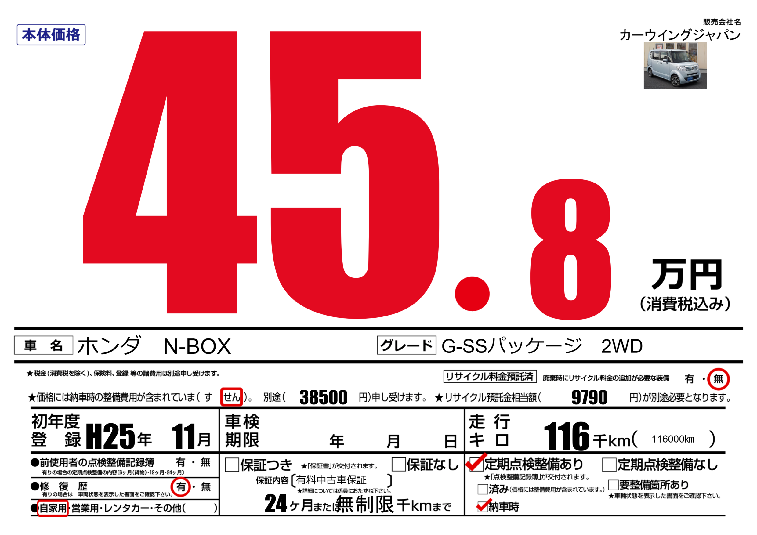 | 車名 | ホンダ N-BOX | グレード ミッション 排気量 |