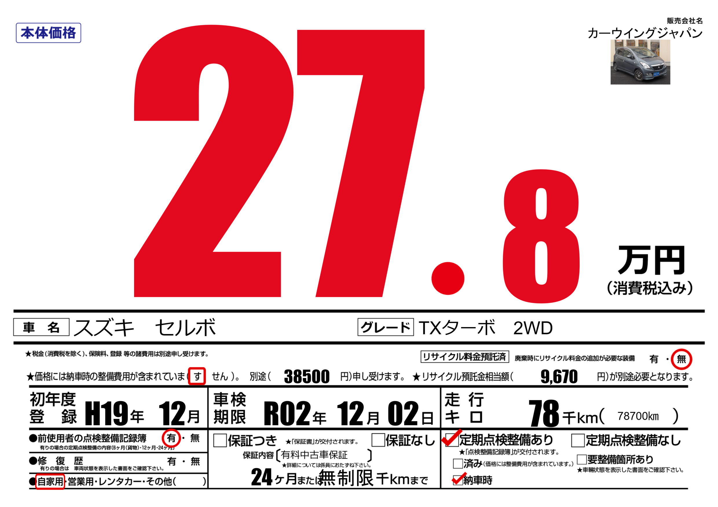 | 車名 | スズキ セルボ | グレード ミッション 排気量 |