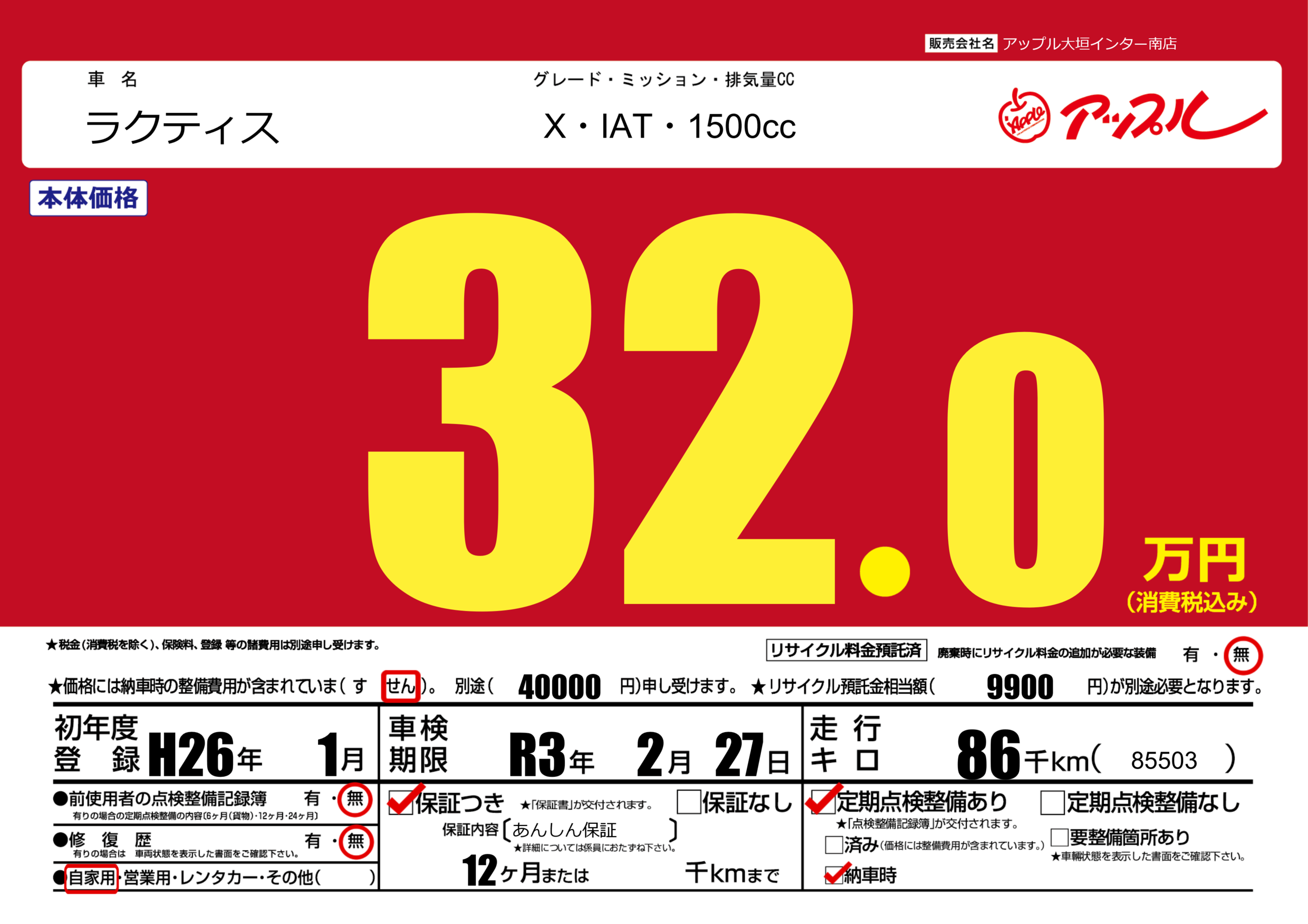 | 車名 | ラクティス | グレード ミッション 排気量 |