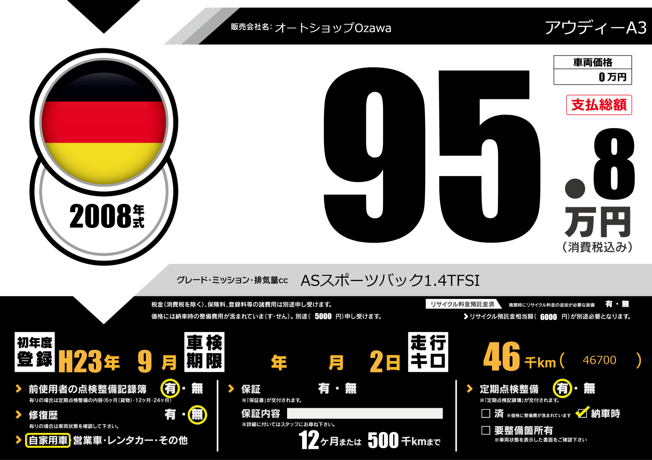 | 車名 | アウディーA3 | グレード ミッション 排気量 |