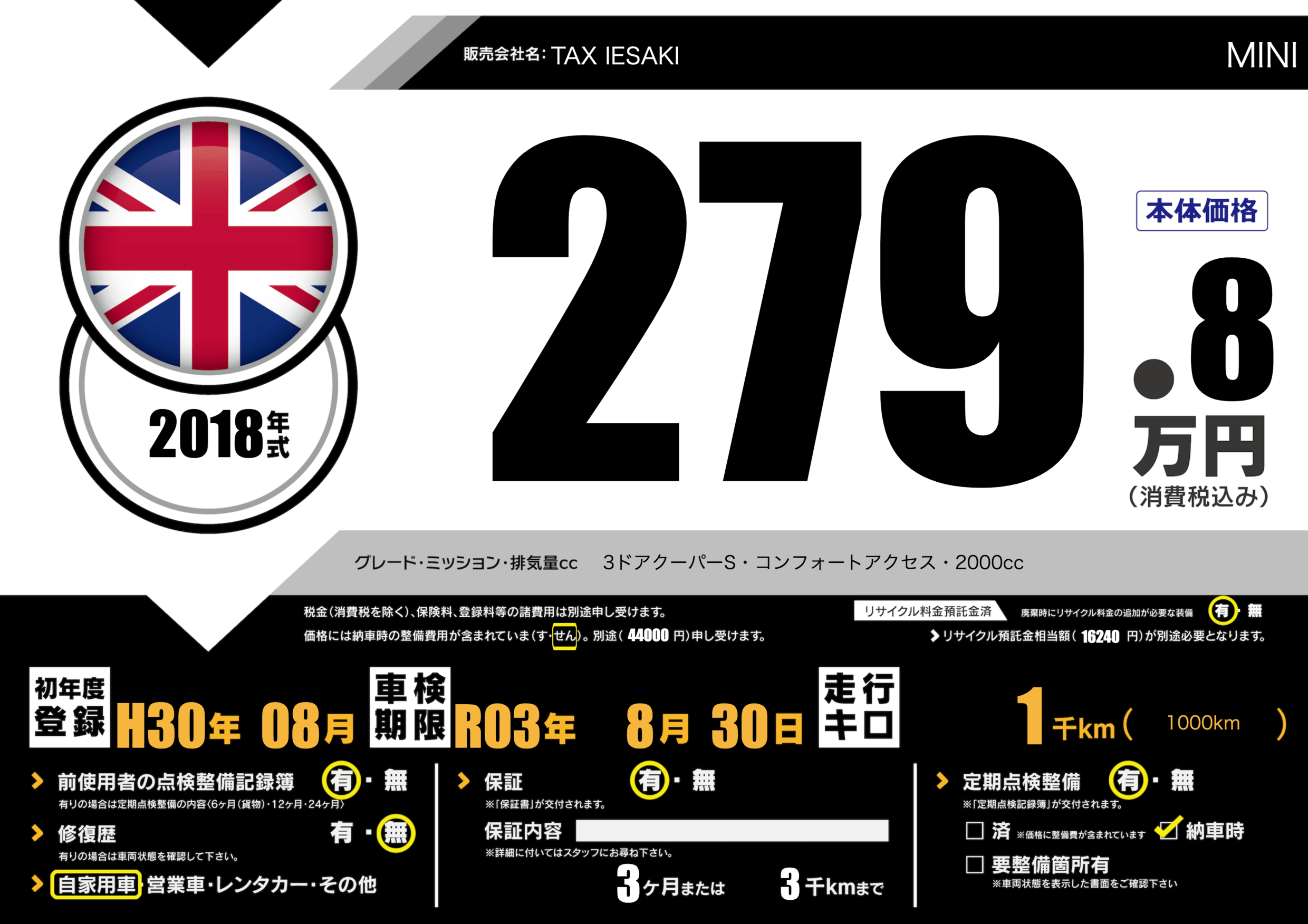 | 走行キロ | 0.1万km | 初年度登録 | H30年08月 |