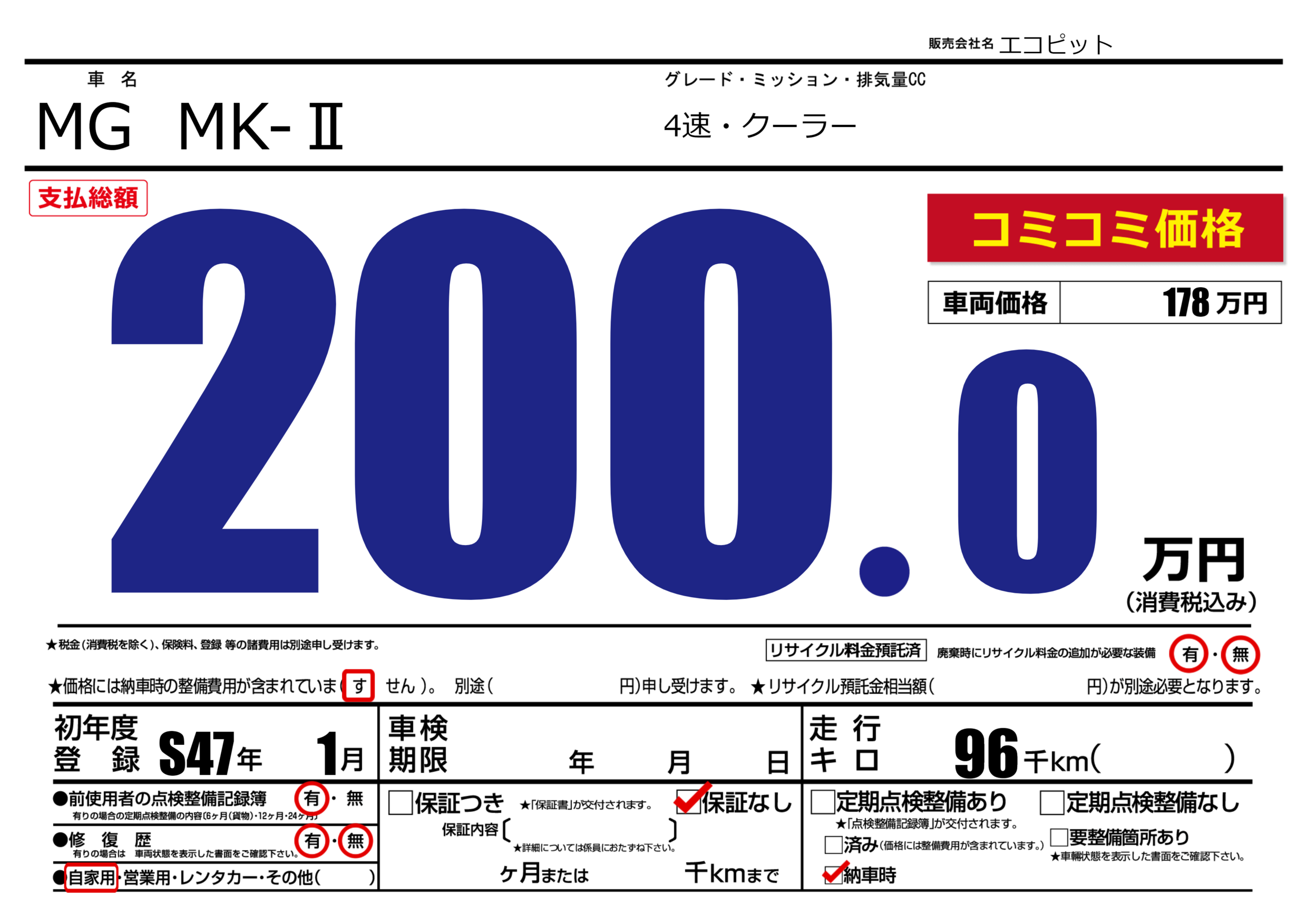 | 走行キロ | 9.6万km | 初年度登録 | S47年1月 |