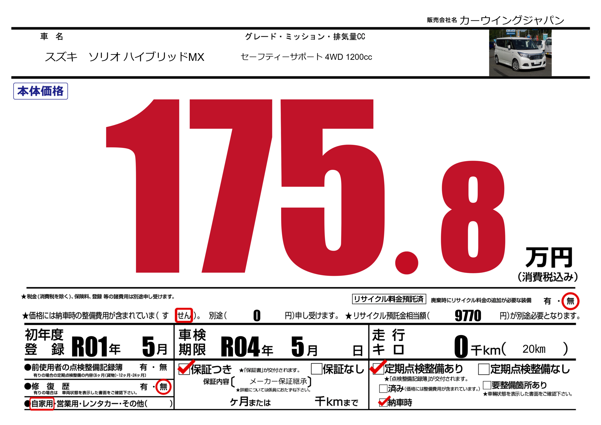 | 車名 | スズキ ソリオ ハイブリッドMX | グレード ミッション 排気量 |