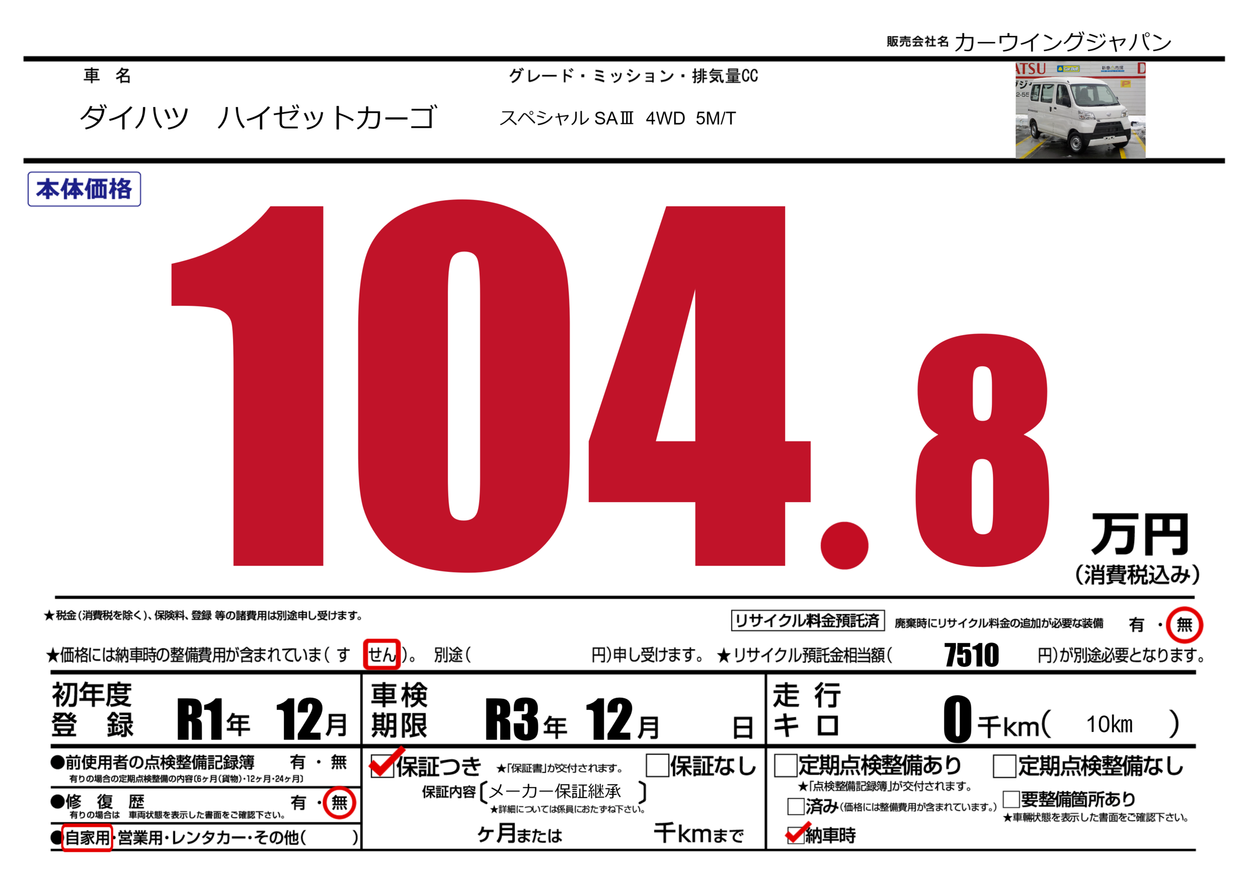 | 車名 | ダイハツ ハイゼットカーゴ | グレード ミッション 排気量 |