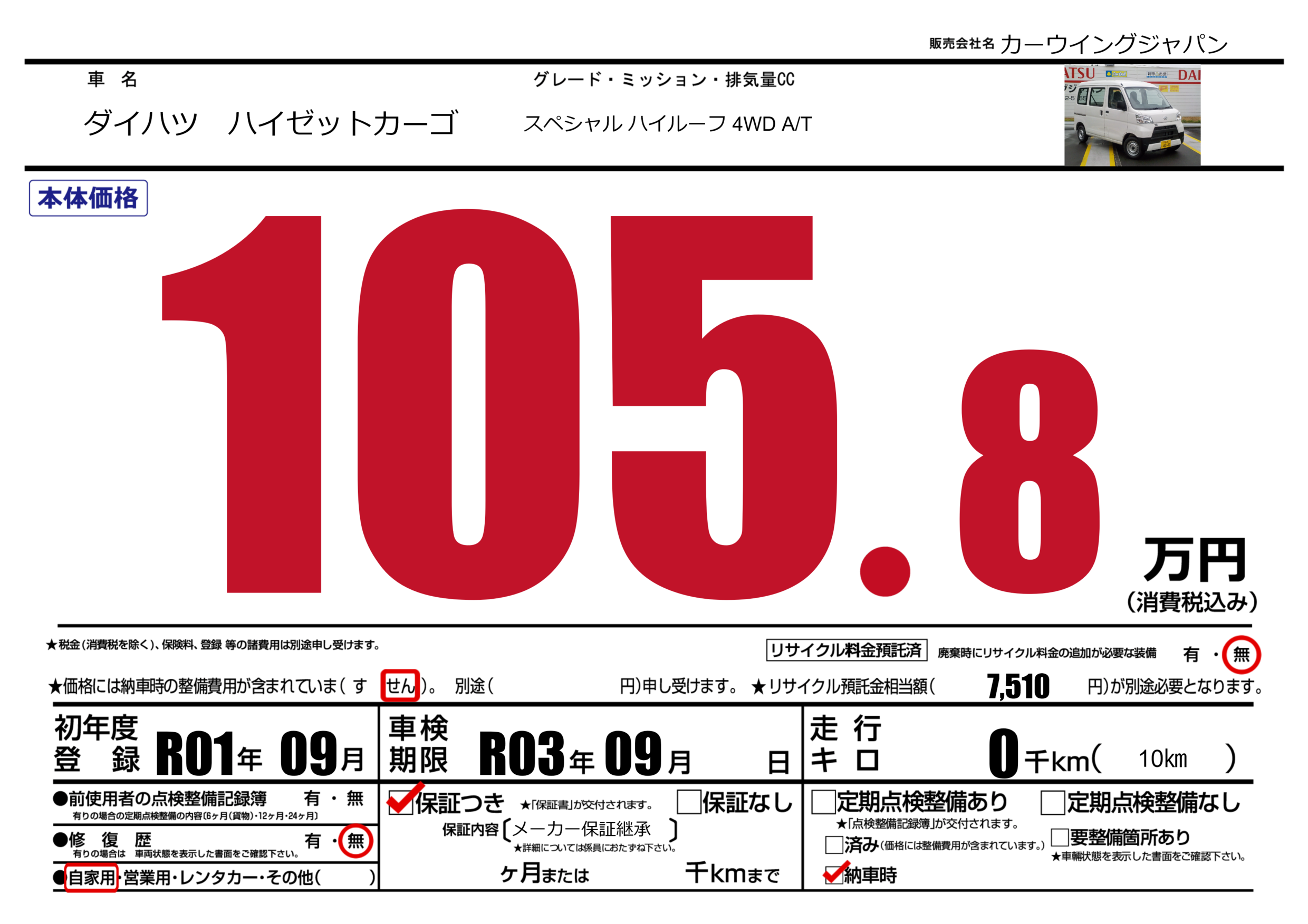 | 車名 | ダイハツ ハイゼットカーゴ | グレード ミッション 排気量 |