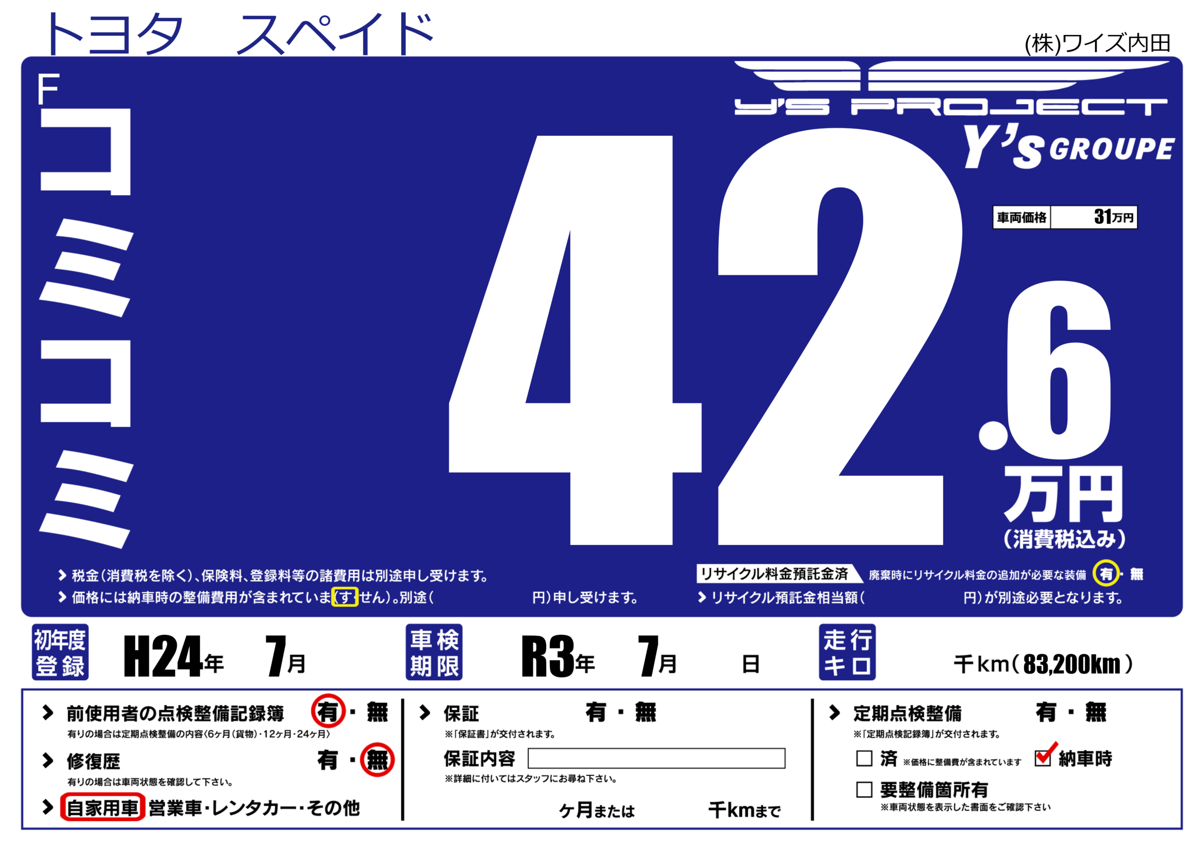 | 車名 | トヨタ スペイド | グレード ミッション 排気量 |
