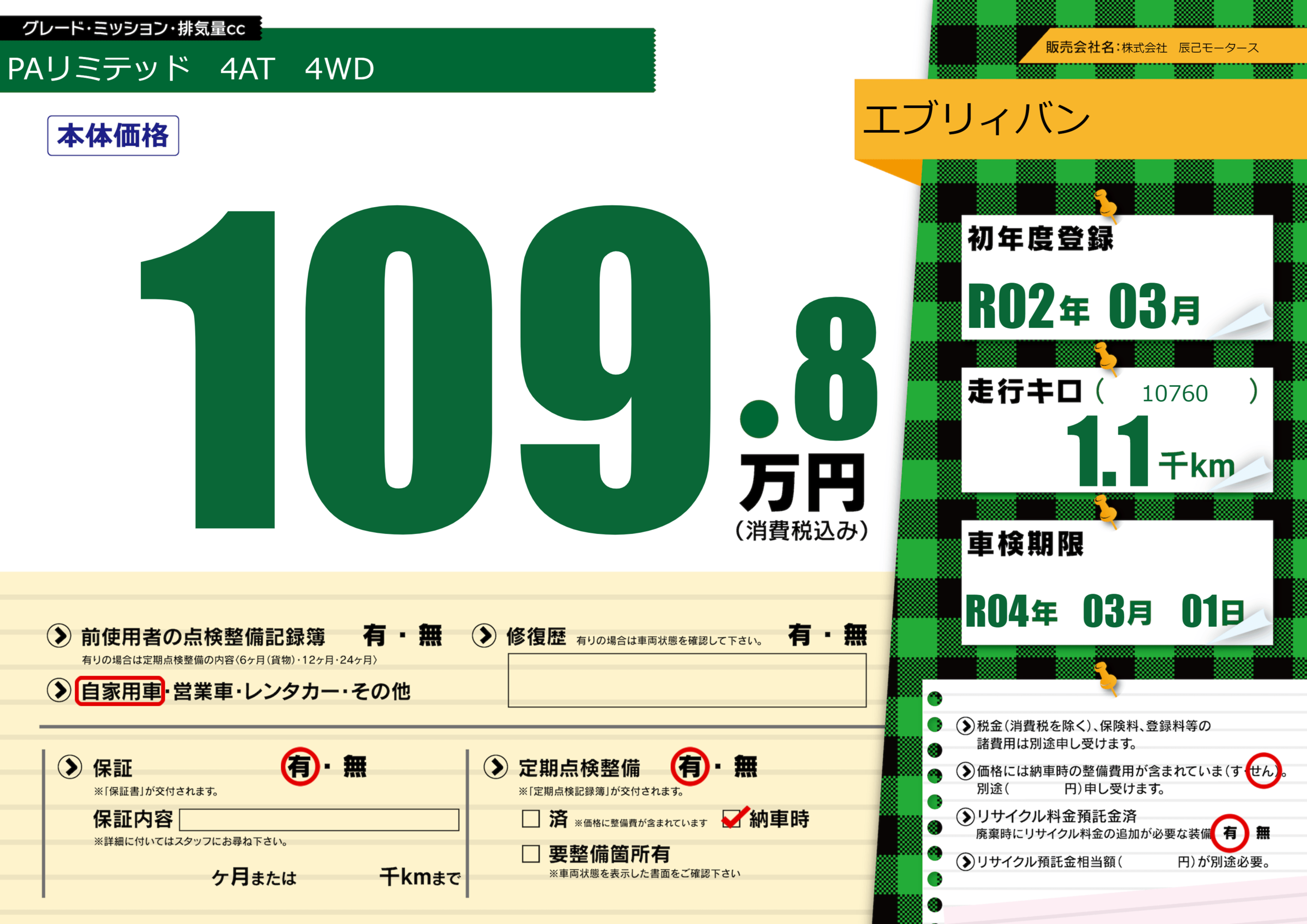 | 車名 | エブリィバン | グレード ミッション 排気量 |