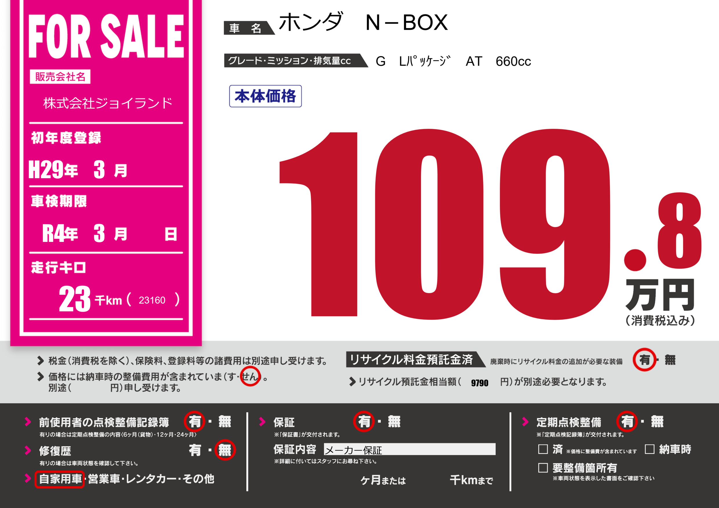 | 車名 | ホンダ N-BOX | グレード ミッション 排気量 |