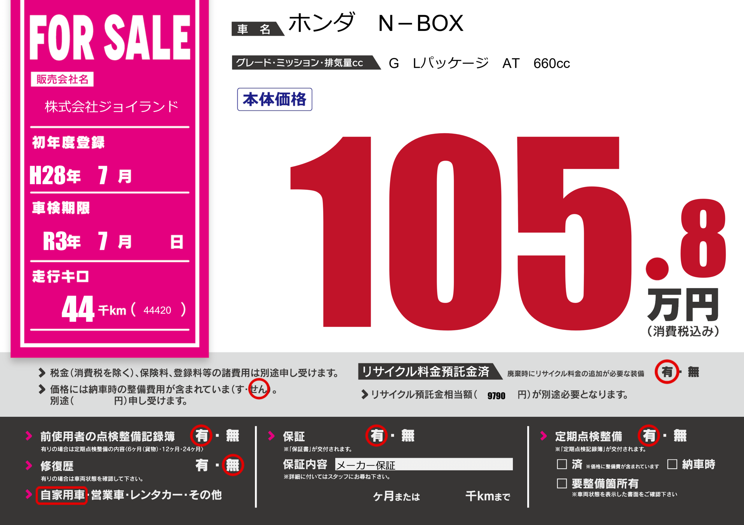 | 車検制限 | R3年 7月 - 日 | ||