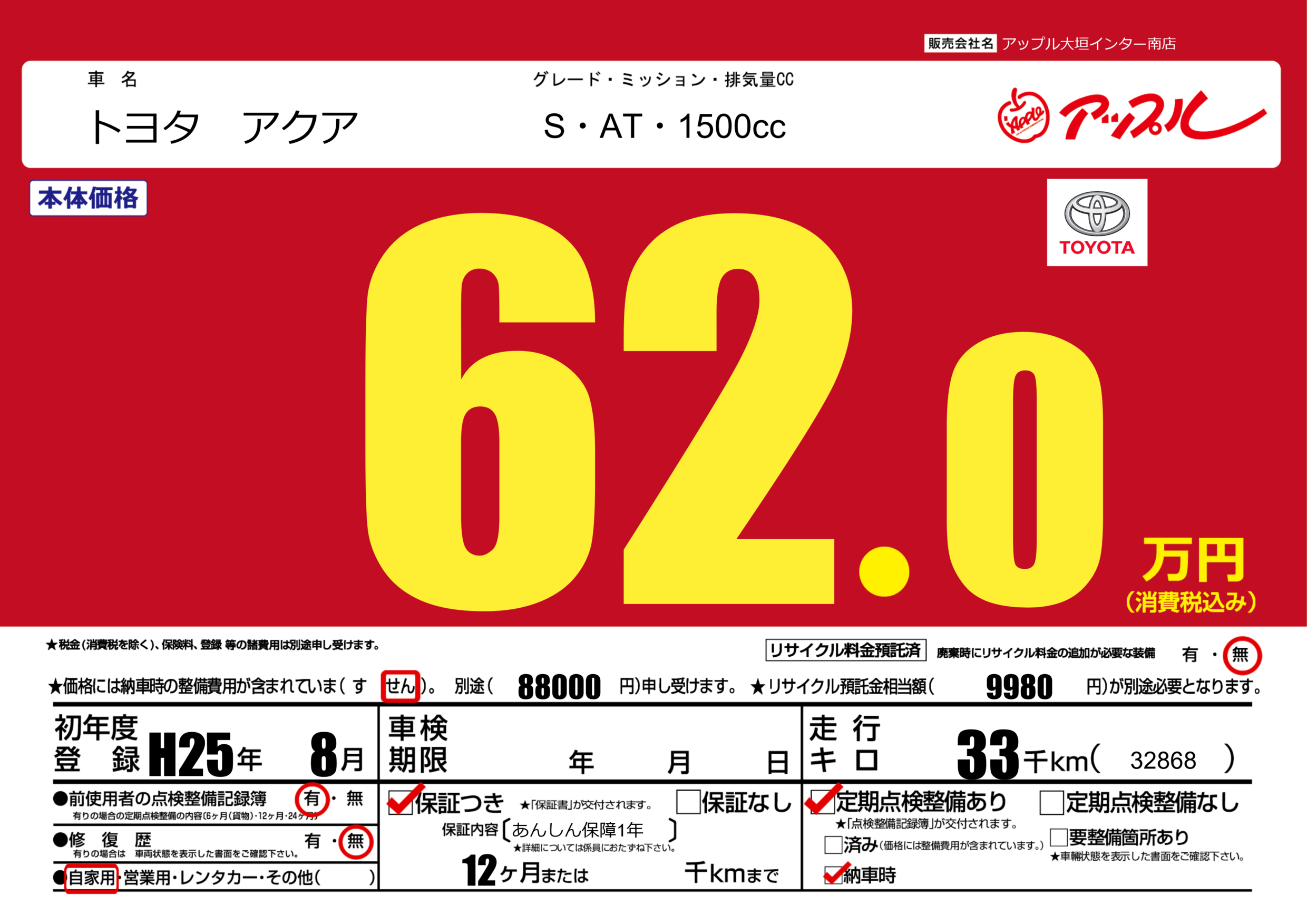 | 車名 | トヨタ アクア | グレード ミッション 排気量 |