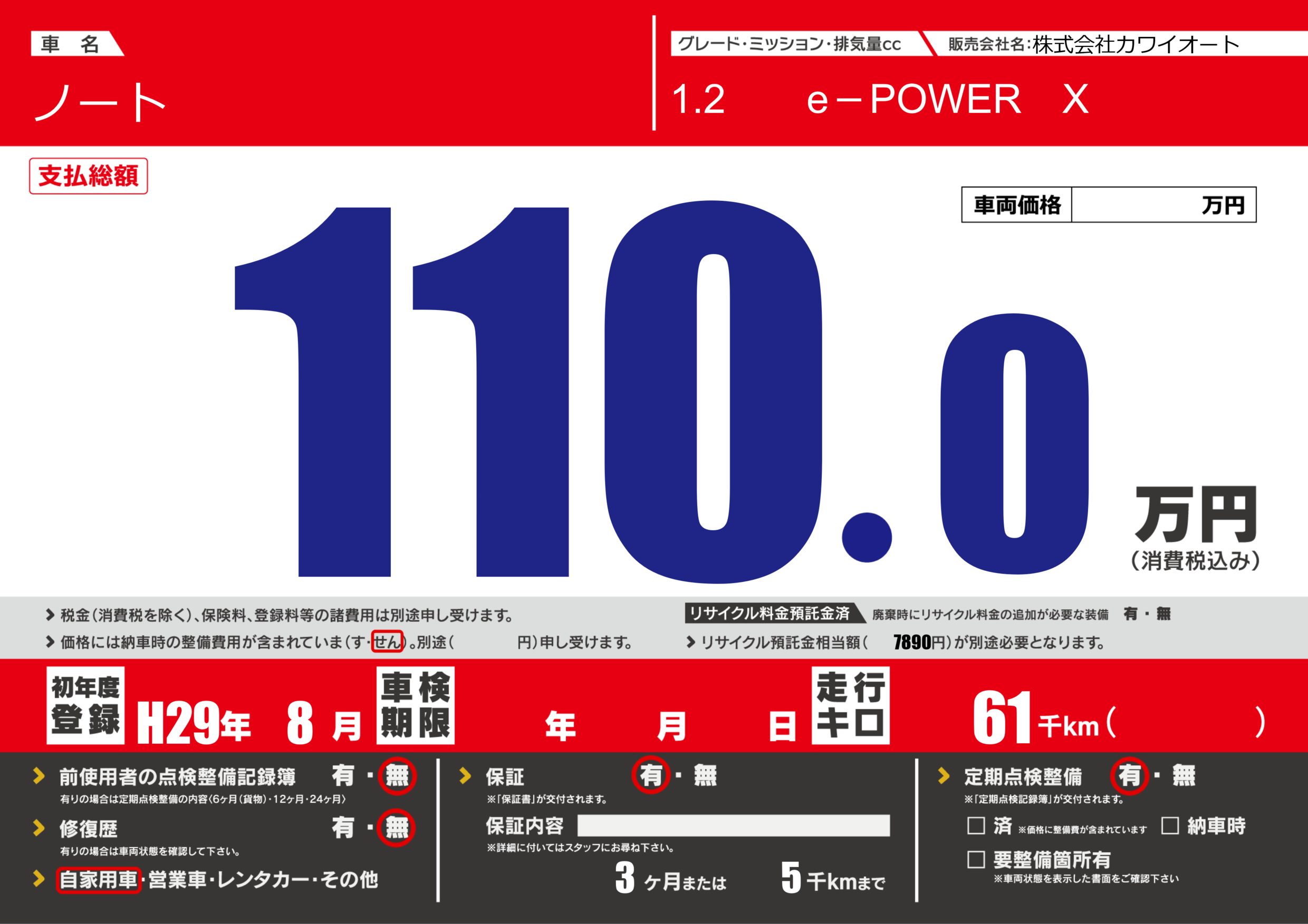 保証付き 保証内容(---) 3ヶ月または(5)千kmまで |