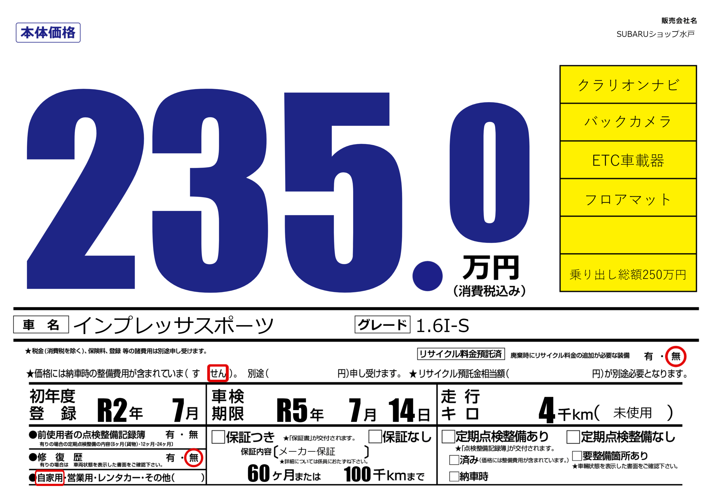 | 車名 | インプレッサスポーツ | グレード ミッション 排気量 |