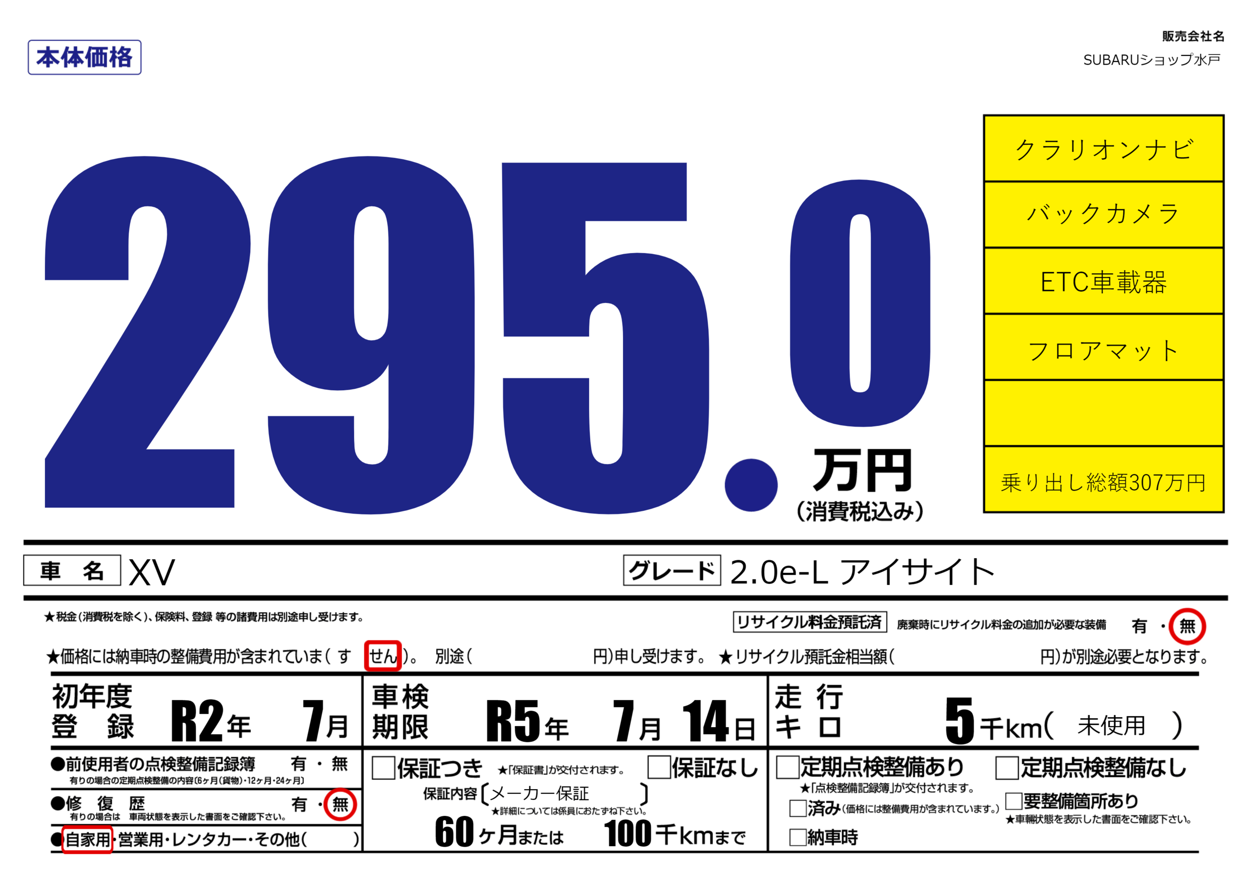 保証なし 保証内容(メーカー保証) 60ヶ月または(100)千kmまで |
