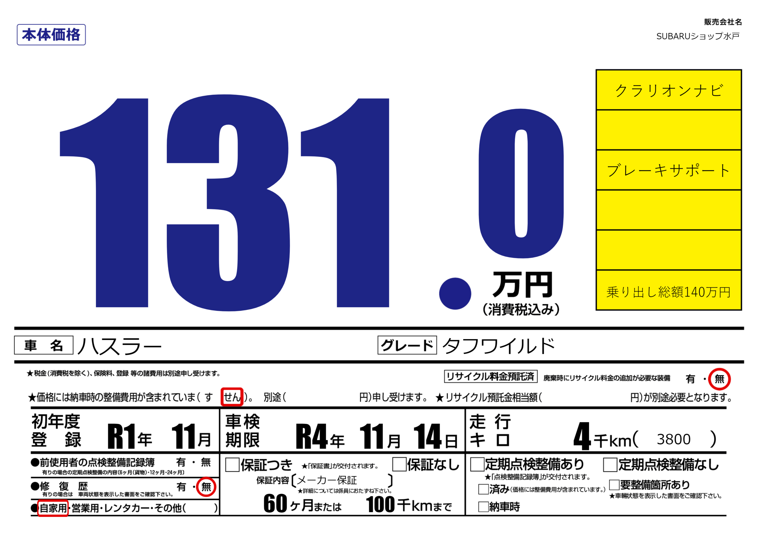 | 車名 | ハスラー | グレード ミッション 排気量 |