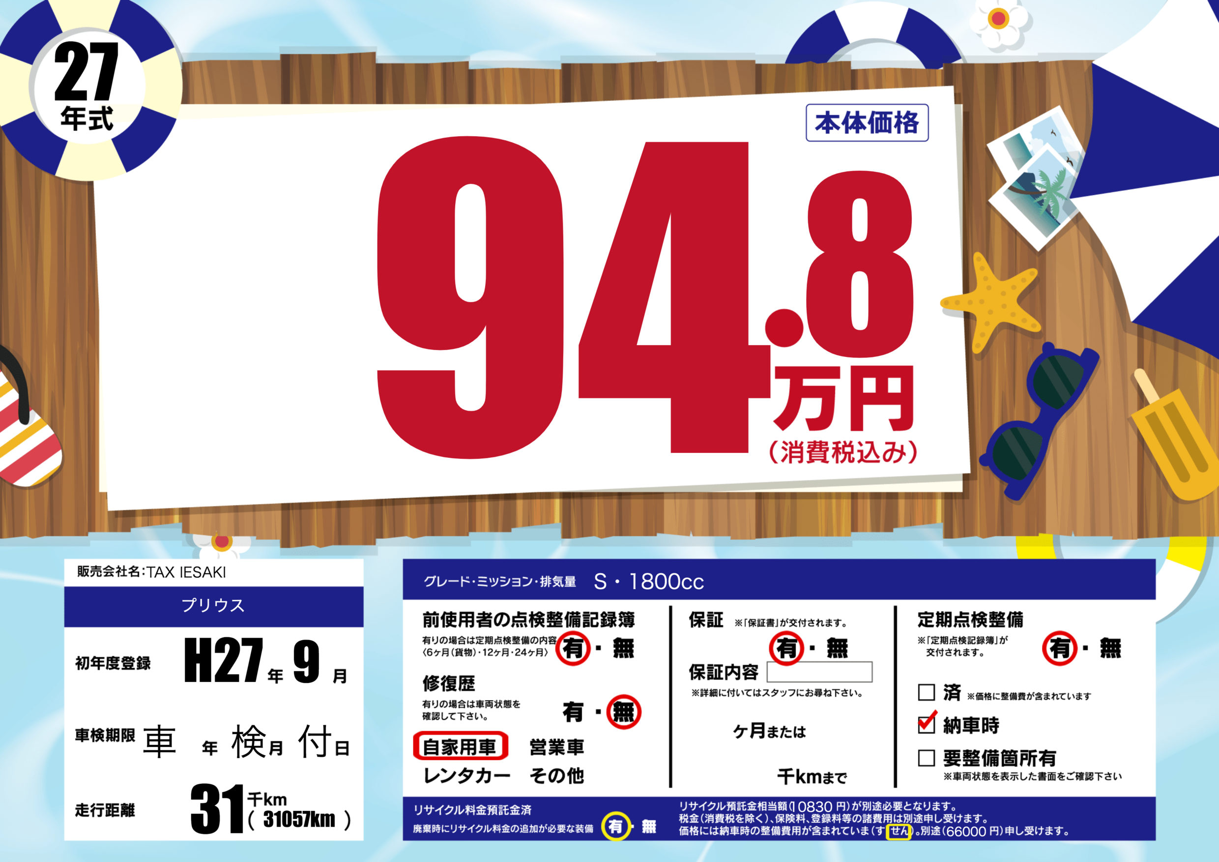 | 走行キロ | 3.1万km | 初年度登録 | H27年9月 |