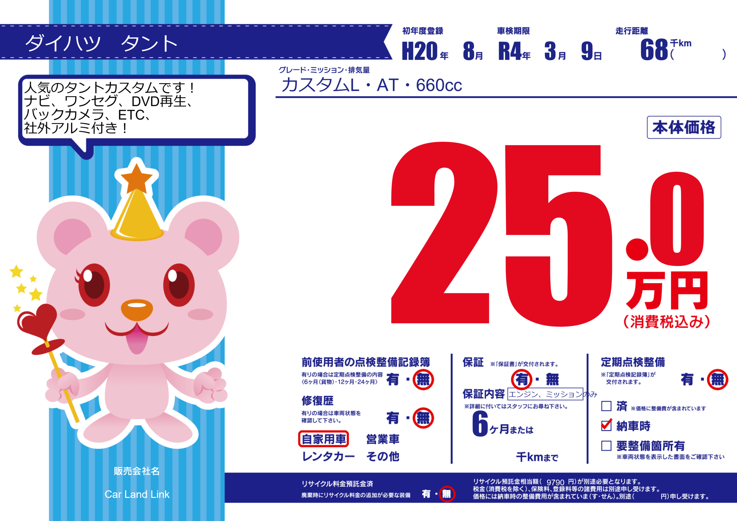 | 車名 | ダイハツ タント | グレード ミッション 排気量 |