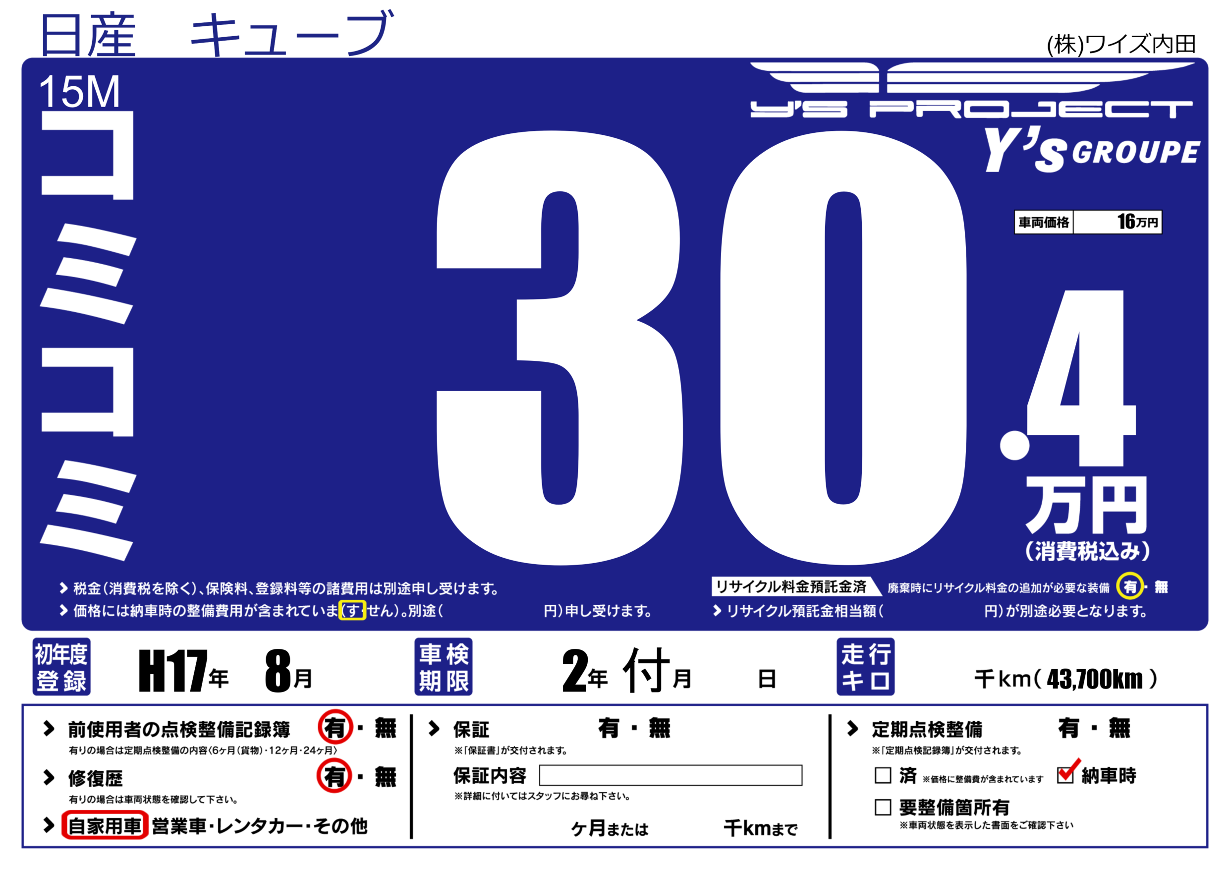 | 車名 | 日産 キューブ | グレード ミッション 排気量 |