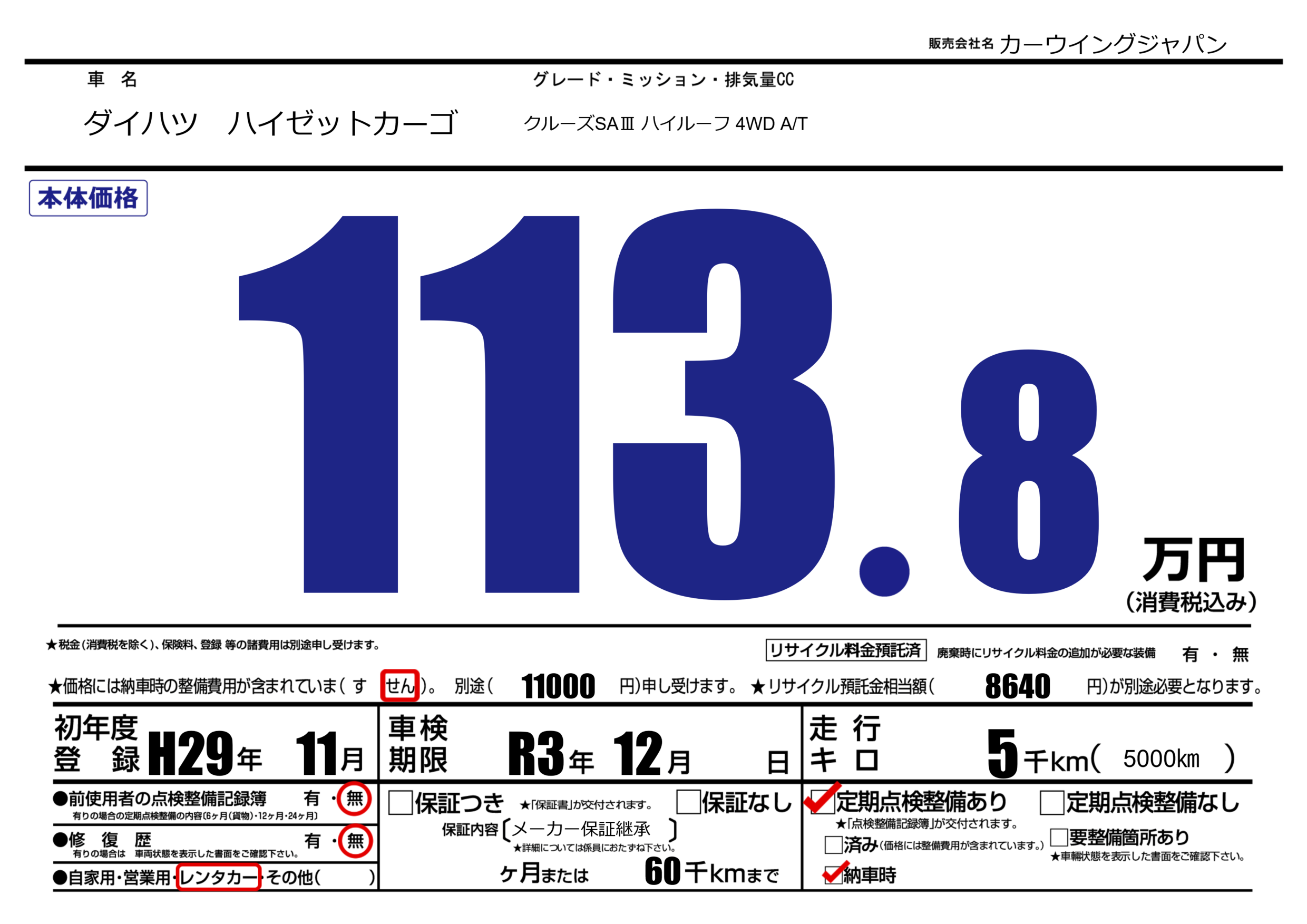 保証なし 保証内容(メーカー保証継承) ---ヶ月または(60)千kmまで |