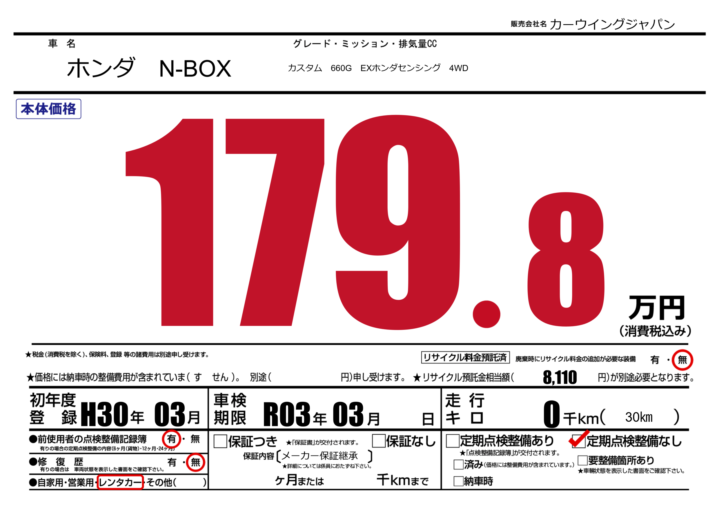 | 車名 | ホンダ N-BOX | グレード ミッション 排気量 |