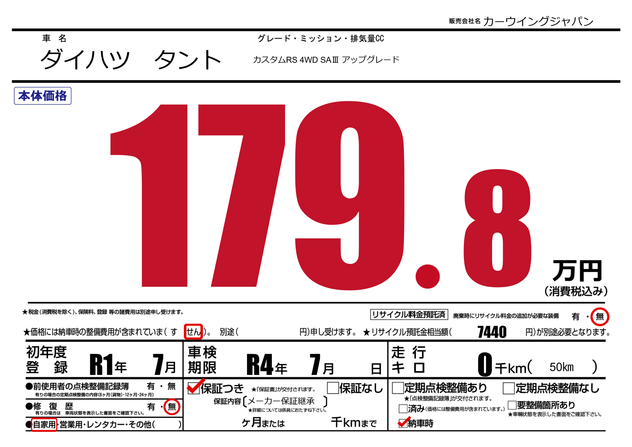 | 車名 | ダイハツ タント | グレード ミッション 排気量 |