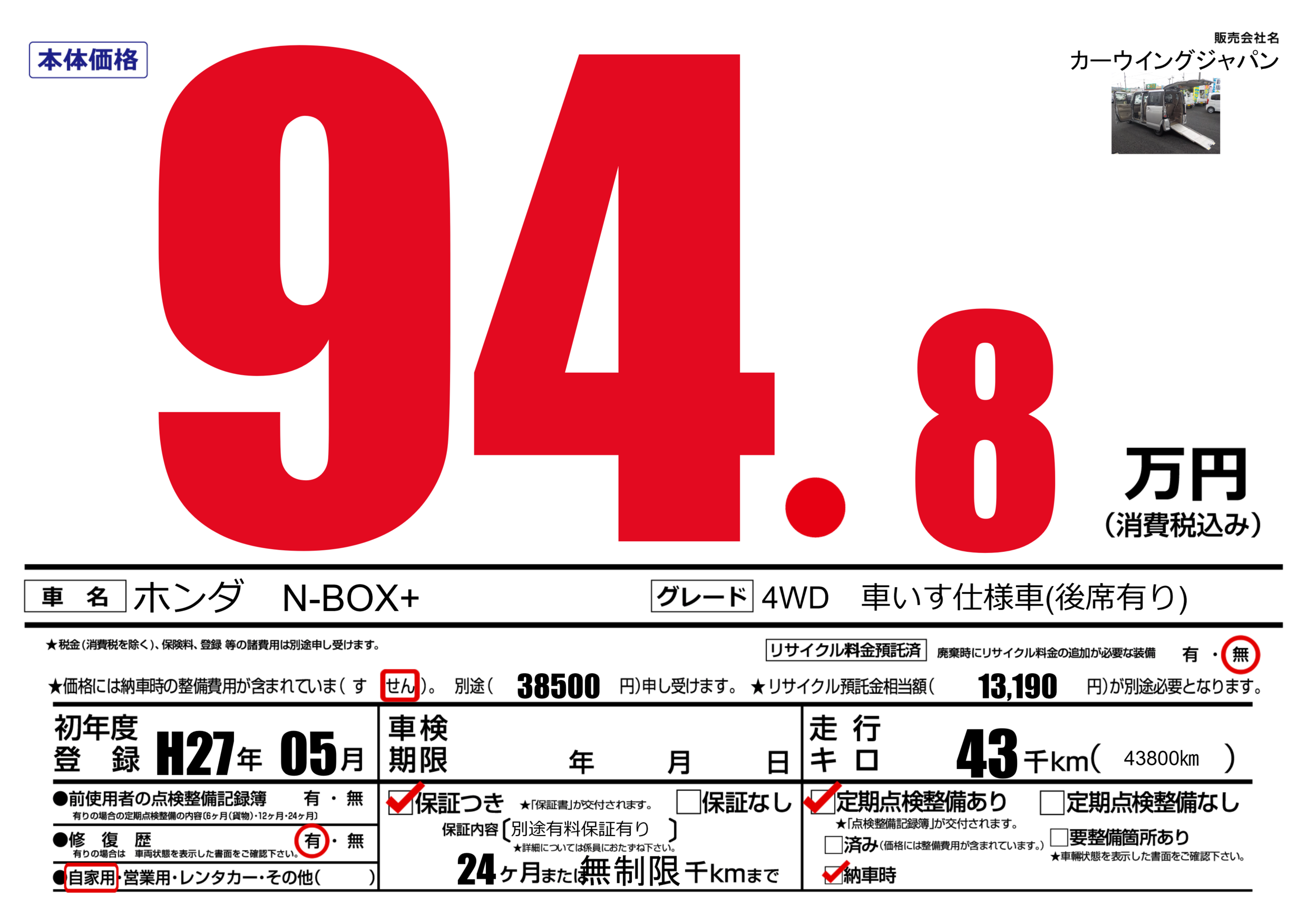 | 車名 | ホンダ N-BOX+ | グレード ミッション 排気量 |