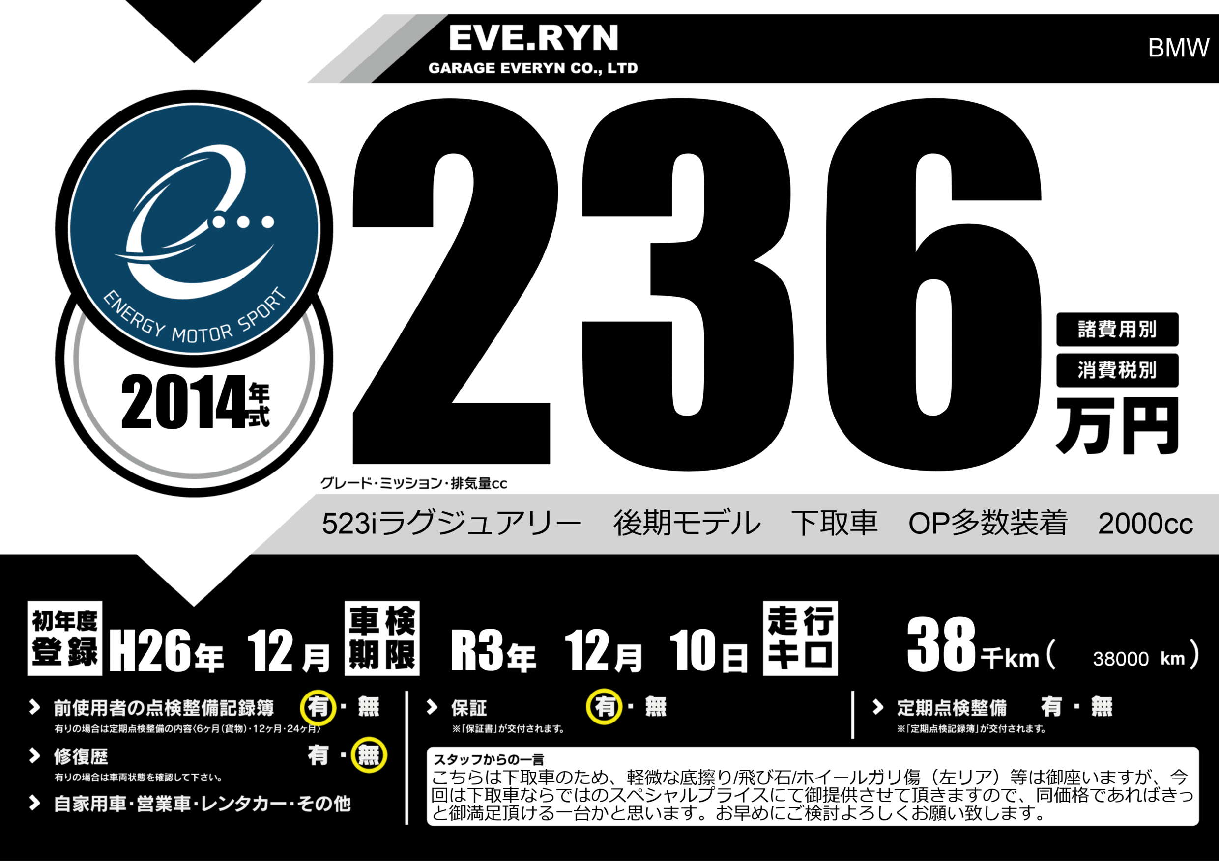 | 走行キロ | 3.8万km | 初年度登録 | H26年12月 |