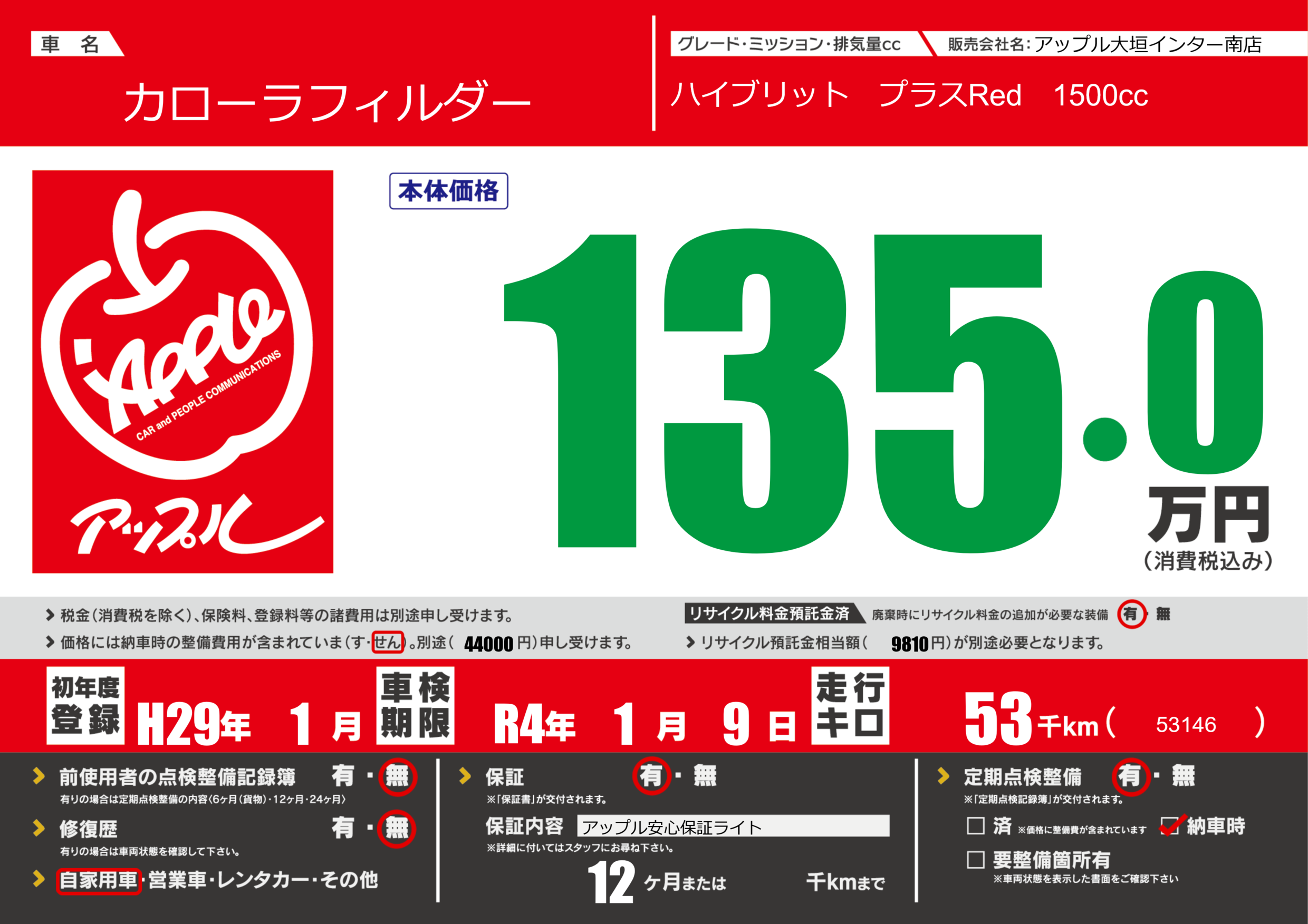 保証付き 保証内容(アップル安心保証ライト) 12ヶ月または()千kmまで |