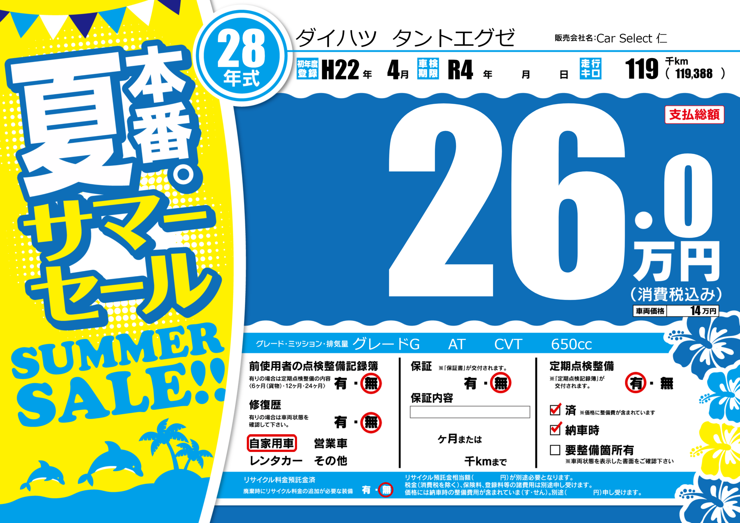 | 車名 | ダイハツ タントエグゼ(売約済) | グレード ミッション 排気量 |