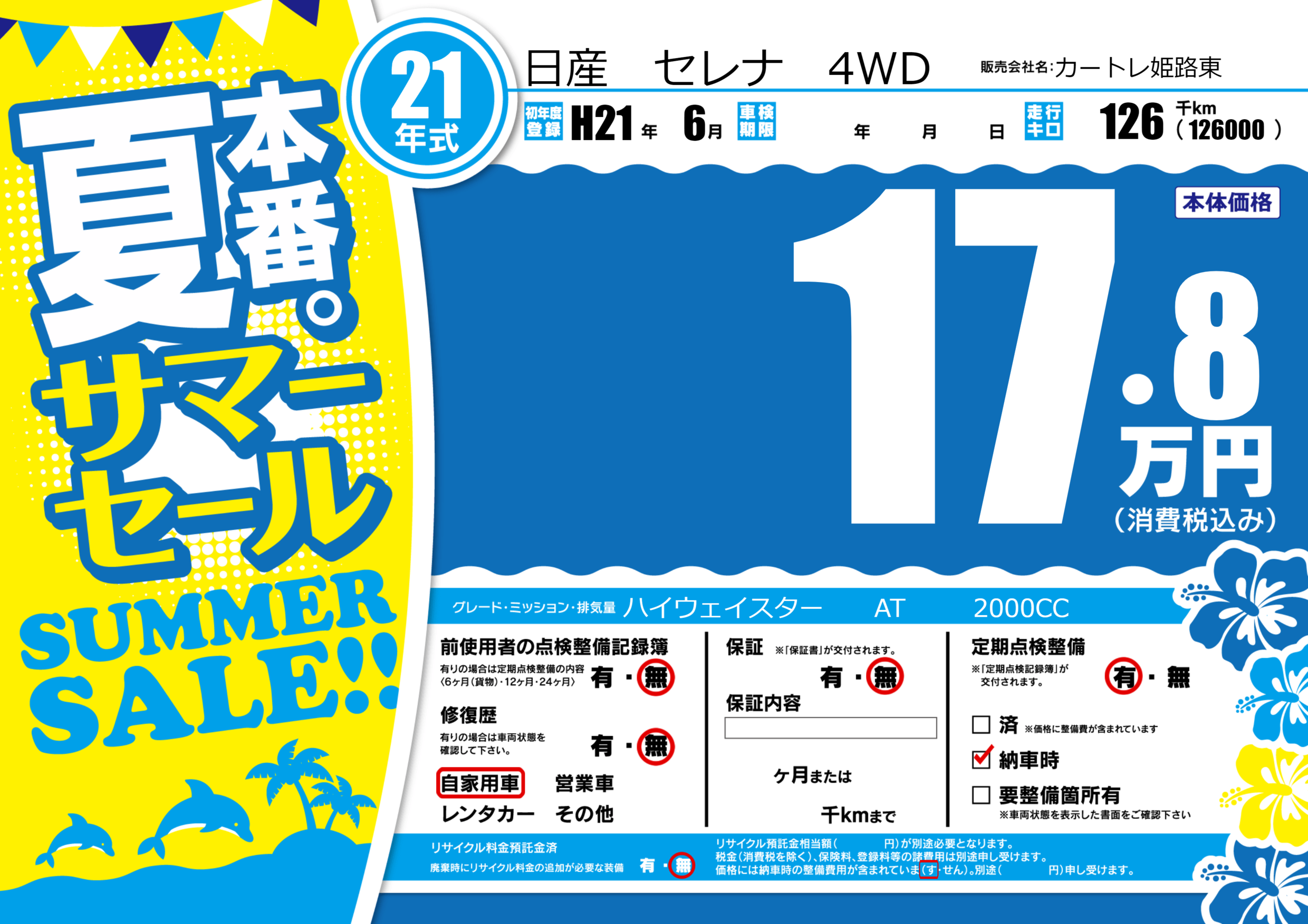 | 走行キロ | 12.6万km | 初年度登録 | H21年6月 |