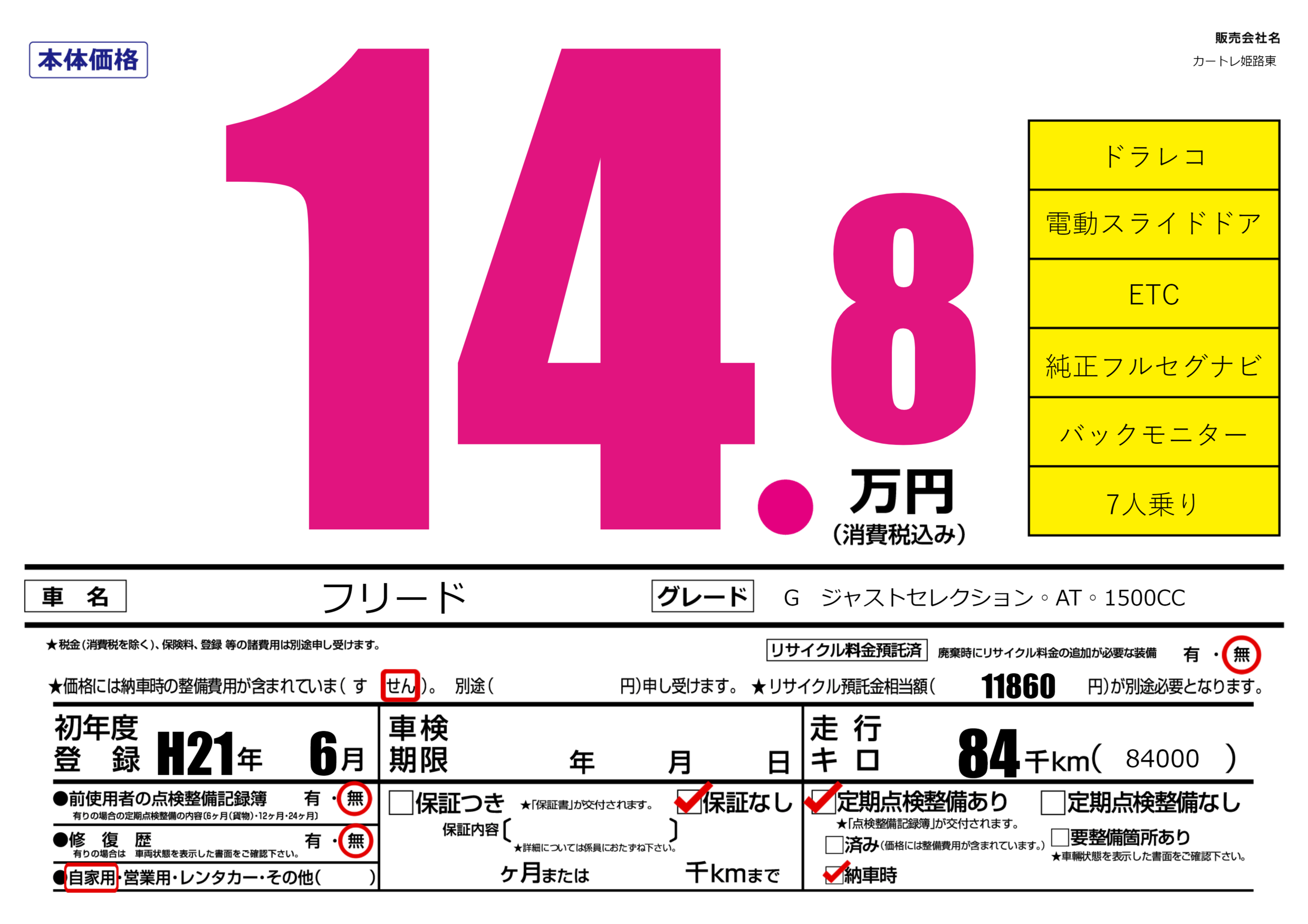 | 走行キロ | 8.4万km | 初年度登録 | H21年6月 |
