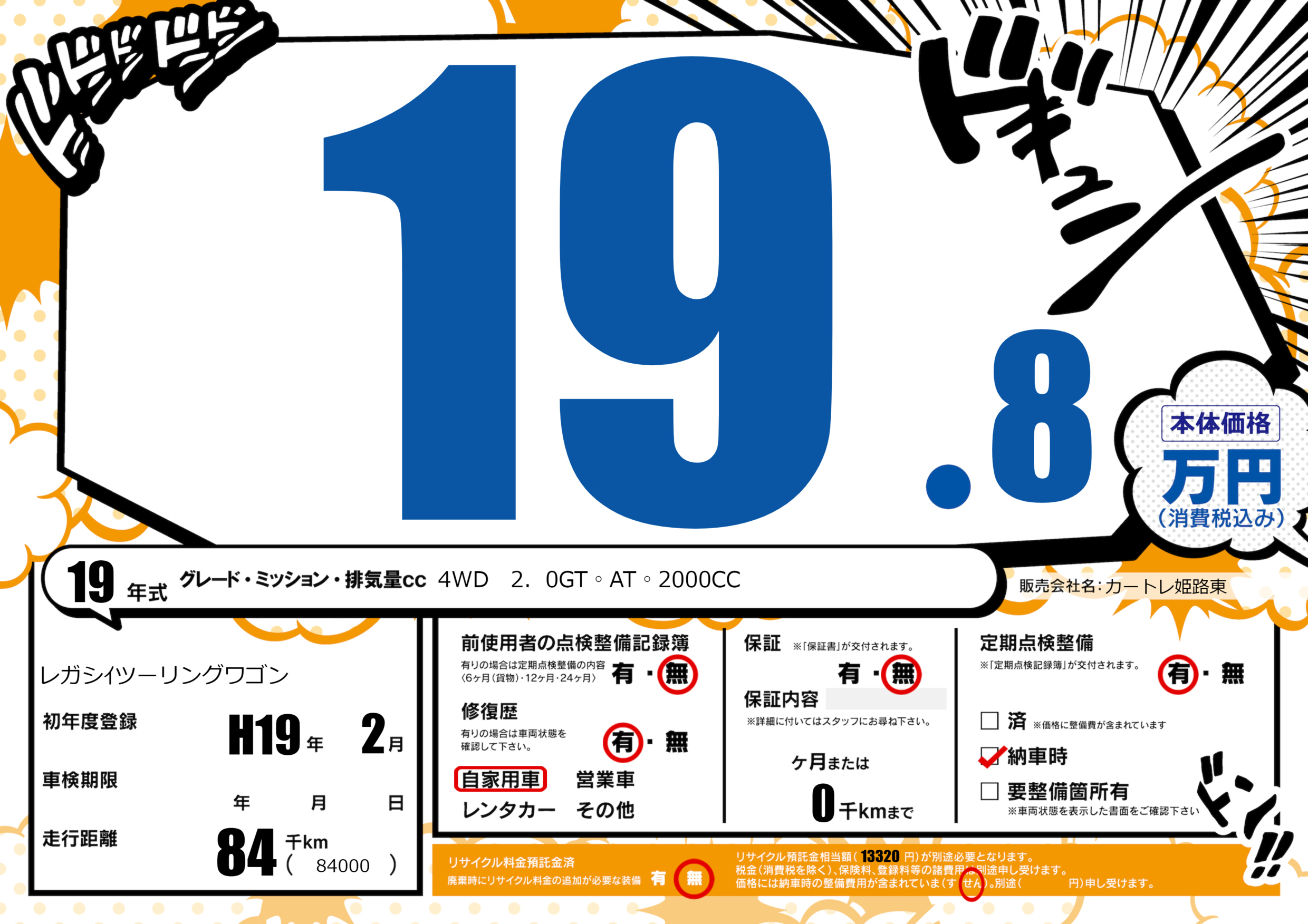 | 車名 | レガシイツーリングワゴン | グレード ミッション 排気量 |
